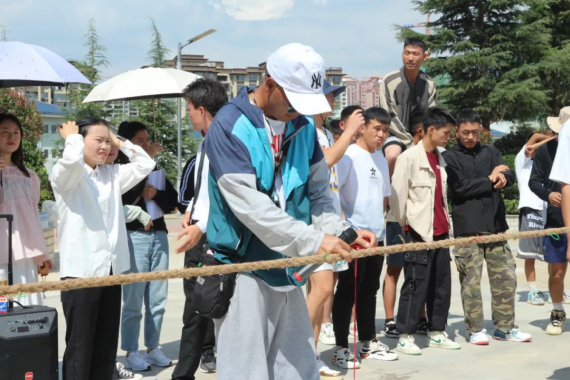 比赛过程中,各参赛队员运用技巧,铆足了劲、涨红了脸,紧抓绳子全力以赴。一旁观看的教师组成“临时啦啦队”,为参赛队员加油助威。加油声、欢呼声此起彼伏,现场欢腾热闹。