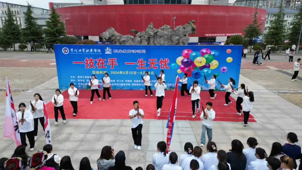 勒系琳副校长向在场师生介绍了本届活动周的看点与亮点。他指出,2024年职业教育活动周,贵州工贸职业学院主要活动为:开幕式和技能展示活动、邀请外校学生参观实训室、学习职业教育法规、开展职业教育活动周主题班会、校友返校及工匠进校园、校企集中签约、校园招聘会等,并通过校园网、微信公众平台等媒体,宣传展示我校职业教育改革发展成果,展示我校支持实验实训、技能培训、促进就业创业等方面的成效,使广大群众更加深入地了解我校办学实力,提升我校社会关注度和认可度。他勉励青年学子:要敢于创新,提升创新思维和创造能力、实践能力、解决复杂问题等能力,将大量创新成果转化为现实生产力,推进大众创业、万众创新,为我校学生成长搭建更广阔平台,为国家富强、民族振兴、人民幸福打下坚实的基础,为贵州省的经济建设发展做出贡献。来自智造工程学院的学生代表黄翌轩在发言中表示,职业教育是我国教育体系中的重要组成部分,是培养技术技能人才、促进就业创业的重要途径。在学习生活中,深刻感受到职业教育的独特魅力。学校为我们提供了丰富的实践机会,让我们在理论学习的基础上,能够亲手操作、亲身体验。来自生态医药与康养学院的教师代表李倩在发言中表示:在2023年第十八届“挑战杯”国赛红色专项中,从前期准备到接到路演通知积极备赛,时间非常紧急。团队成员发挥自己专长,与时间赛跑,前前后后共修改7版演讲稿,PPT也是几经打磨,直至答辩前一天才最终定稿。期间,针对评委可能提出的问题我们设计了几十个问题提前做准备,这些充分准备给了我们学生底气,把国赛一等奖带回来了。目前,团队成员卢清已免试专升本,成为黔南民族师范学院准本科生。作为一名教师,肩负着培养技能型、应用型人才的重任。在教育教学过程中,不仅要关注学生的理论知识学习,更要注重培养学生的实践能力。