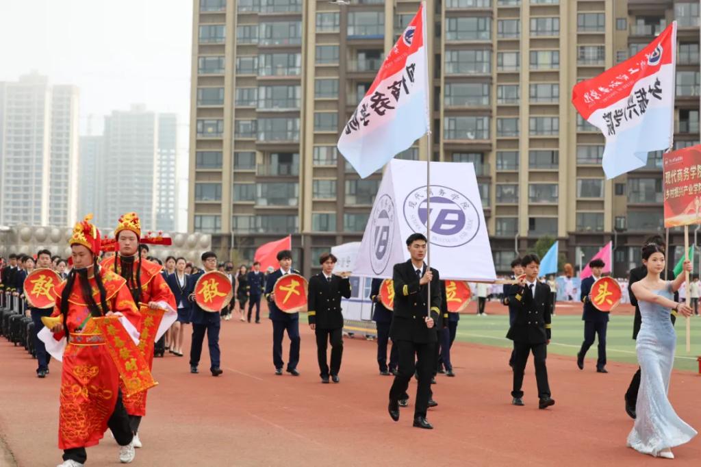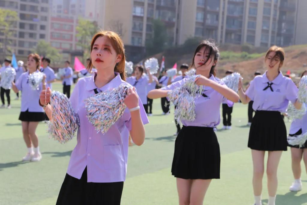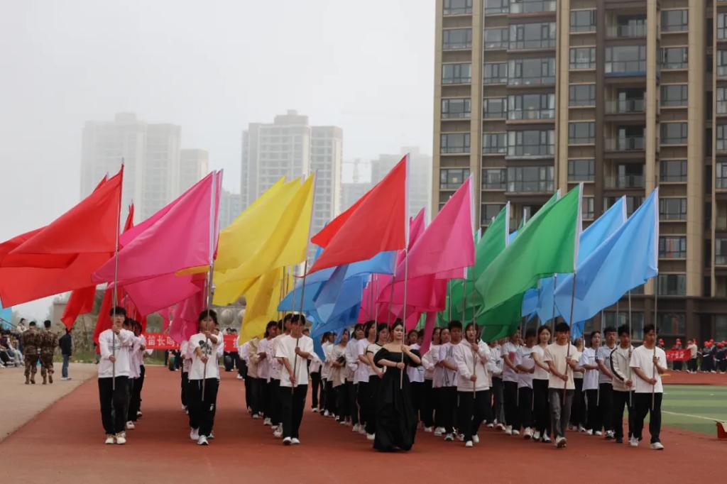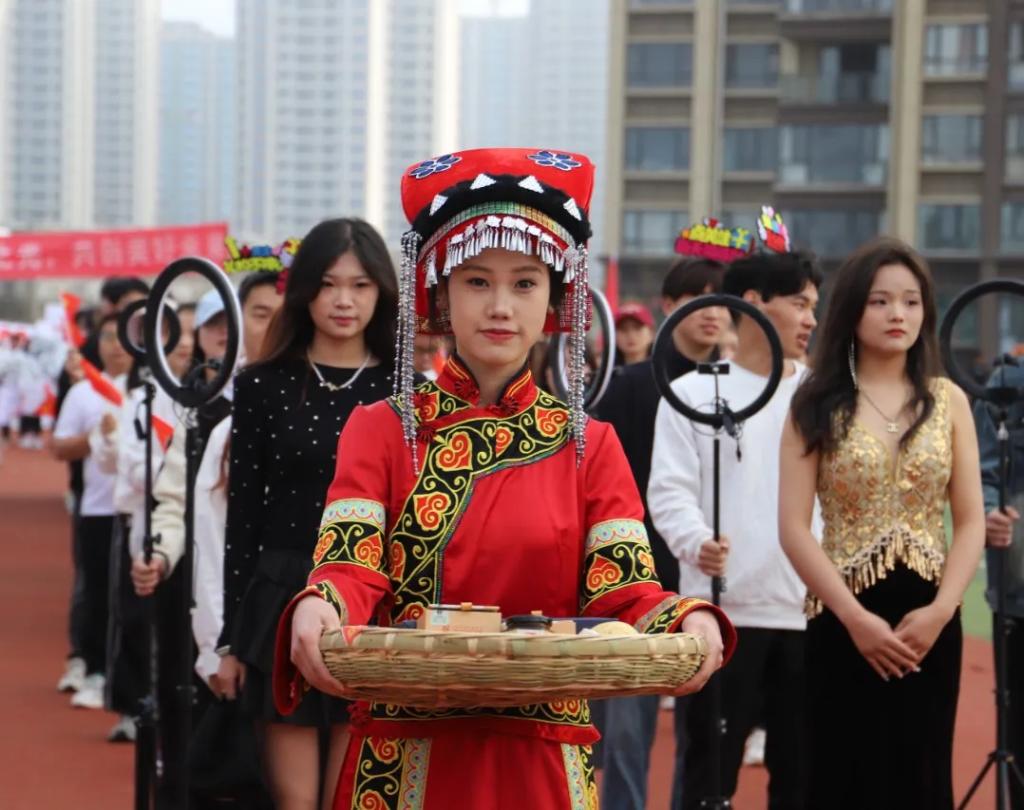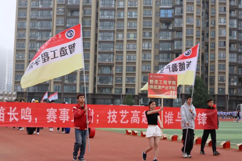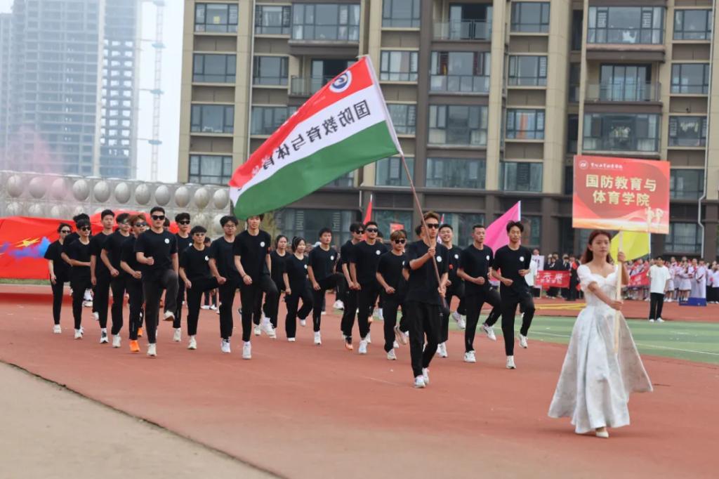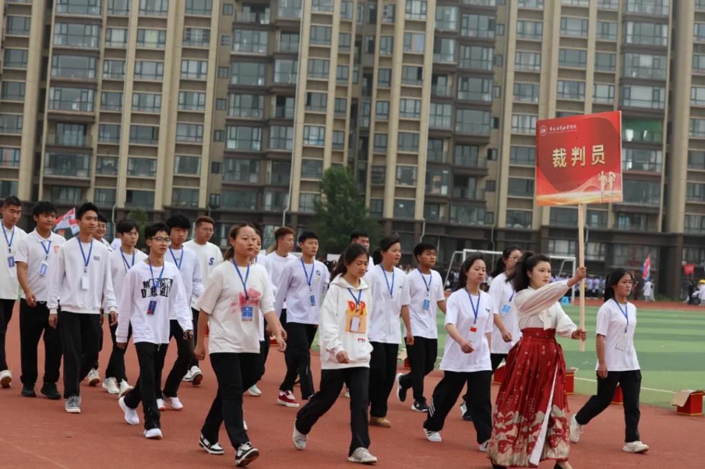 生而逢盛世,青年当有为。草海湖畔,书写着贵州工贸职业学院师生再创辉煌的凌云壮志。5月23日,贵州工贸职业学院第五届校园运动会开幕式在学校田径场正式拉开帷幕。校领导徐锋、李建萍、聂立新、李新发、勒系琳、曾隆槐、杨金钱,校属各单位负责人在主席台就坐,全体师生参加。校党委委员、副校长杨金钱主持开幕式。伴随着《运动员进行曲》激昂的旋律,贵州工贸职业学院第五届运动会拉开序幕。国旗方阵和校旗方阵首先入场,紧接着彩旗方阵、裁判员方阵入场、智造工程学院(新能源产业学院)方阵、现代商务学院(乡村振兴产业学院)方阵、生态医药与康养学院方阵、国防教育与体育学院方阵、艺术学院方阵踏着轻快的步伐,以饱满的精神面貌入场。