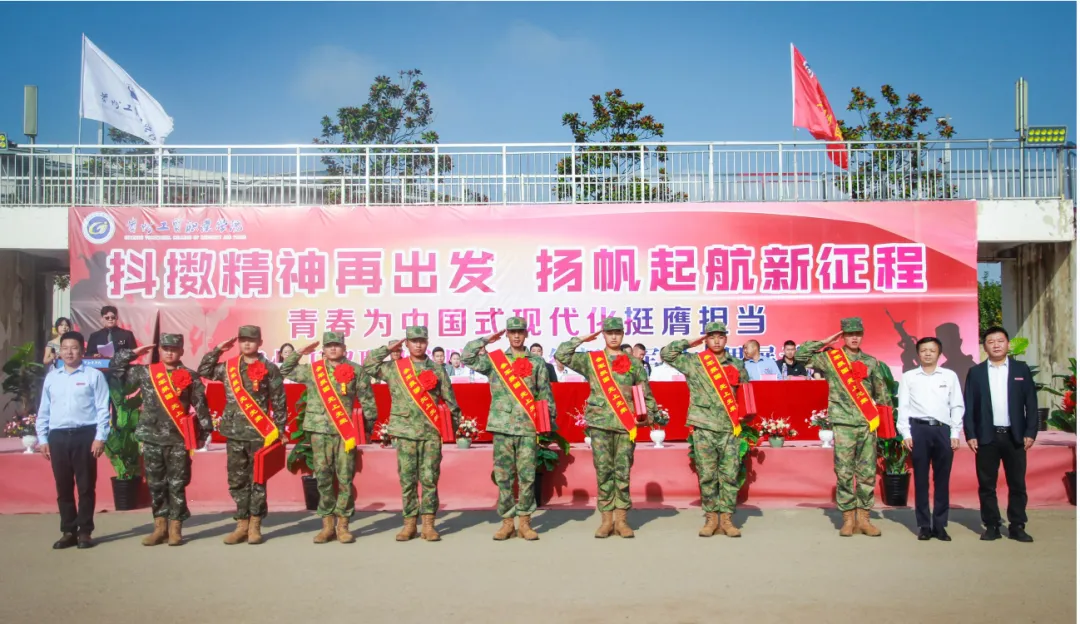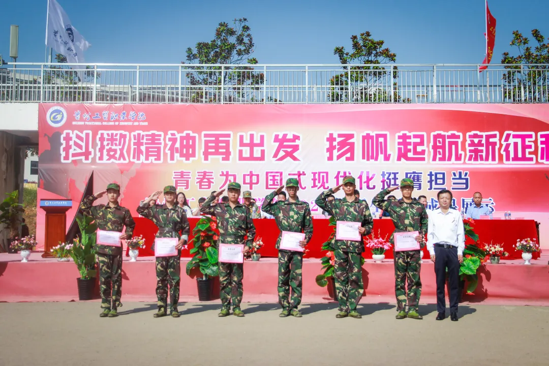 仪式上对军训中涌现出的优秀集体和先进个人予以表彰,宋新乐宣读关于表彰贵州工贸职业学院2024级学生军训先进集体和个人的决定,主席台领导为优秀学员、优秀内务标兵、优秀标兵、优秀学工科长、优秀指导员、道德风尚优秀连队、作风纪律优秀连队、军事训练优秀连队颁奖。