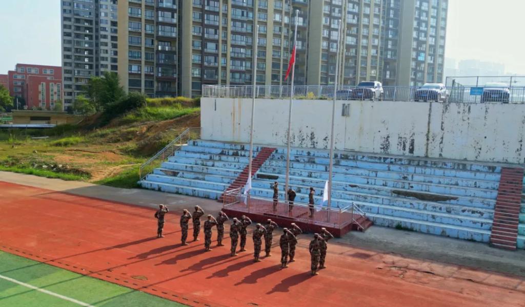 升国旗奏国歌,清风习习,全场肃立心怀敬畏与爱国热忱国旗,在国歌声中升入晴空经过炽阳淬炼的新生在碧空下仰望五角星光。