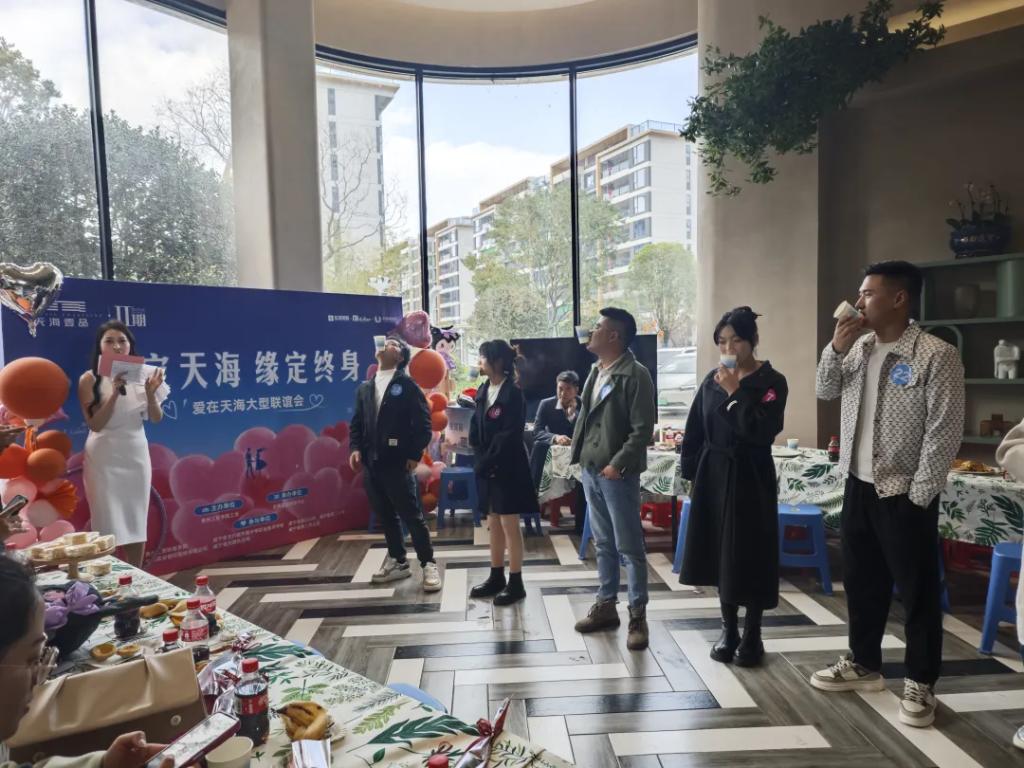 活动现场爱意满溢,主办方精心营造氛围,室内主背景以浪漫画面搭配气球装点,主题茶歇区摆满美味甜点。嘉宾们签到后领取号码臂贴与鲜花,开启寻爱之旅。