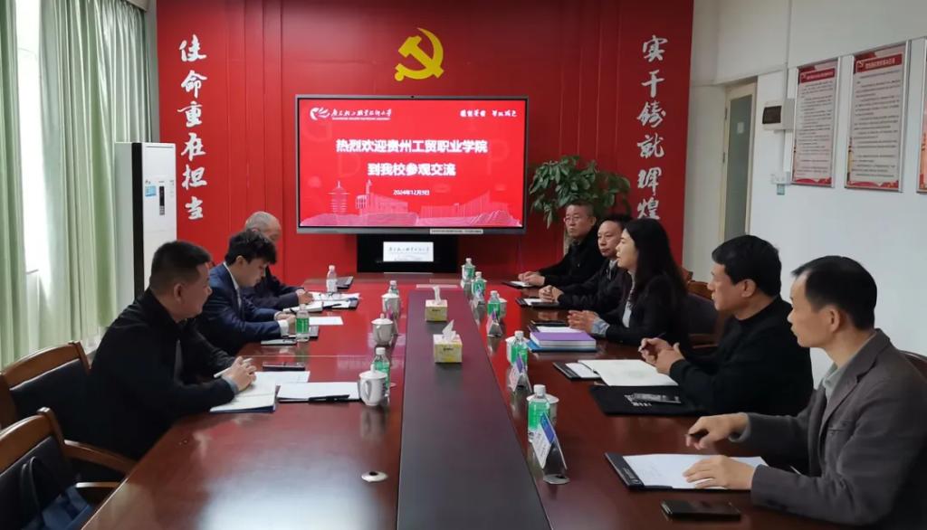 12月9日,贵州工贸职业学院理事长黄冠迪率校党委委员、副校长李新发、宋新乐一行3人到广东轻工职业技术大学对接帮扶事宜。广东轻工职业技术大学党委副书记梁艳珍在新港校区办公楼二楼会议室举行接待。