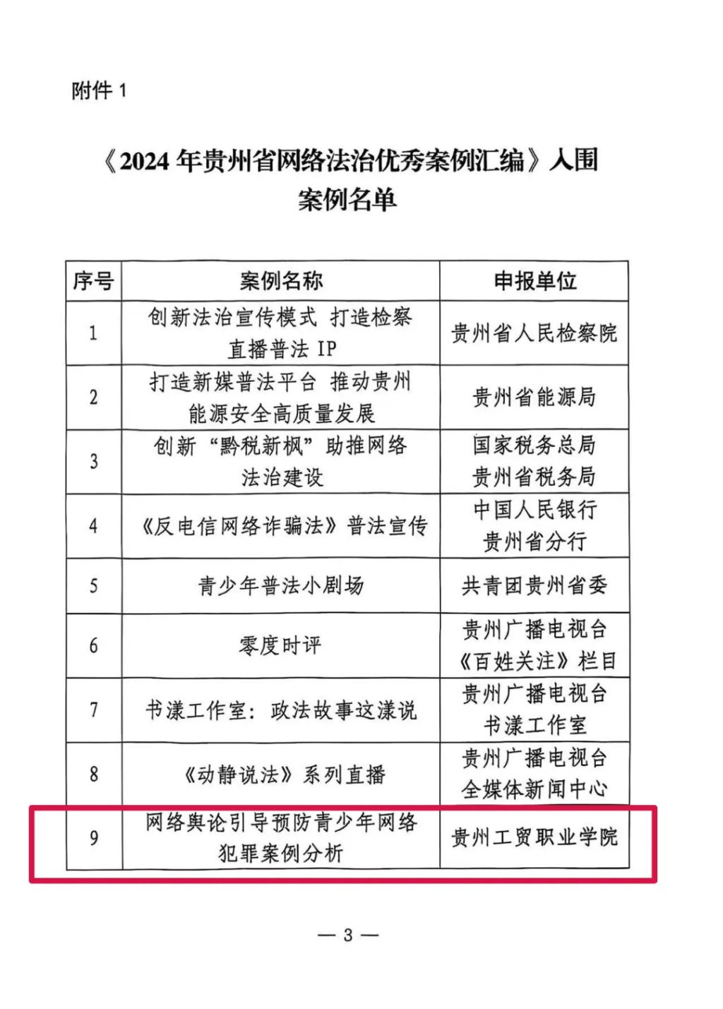 日前,由贵州省委网信办主办的2024年贵州省网络法治优秀案例征集活动结果出炉,经过案例申报、案例初筛、线下集中评审等环节,最终确定51个案例入编《2024年贵州省网络法治优秀案例汇编》,其中,贵州工贸职业学院一案例入选。
