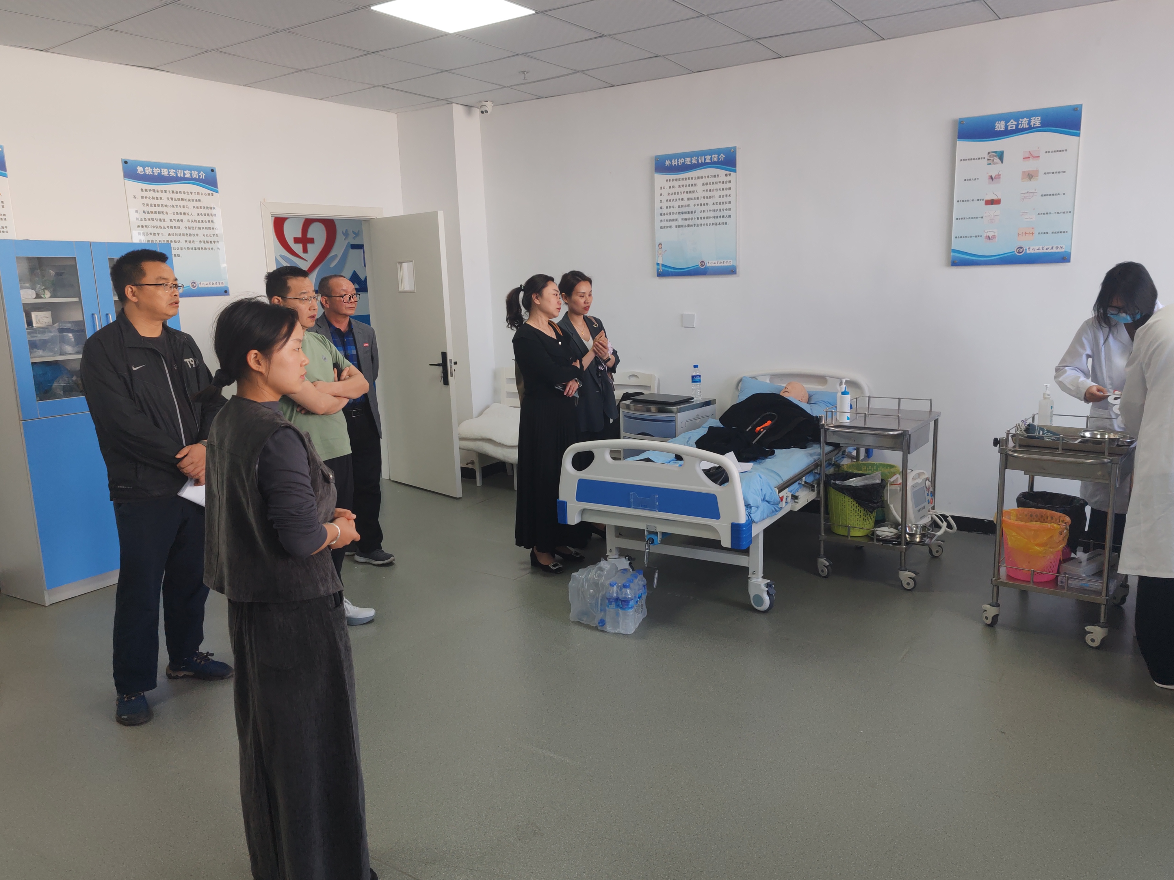 鲁定军一行在学校领导陪同下,先后参观高原预征训练基地、护理实训室、音乐厅(辰海大剧院)等教学实践平台。