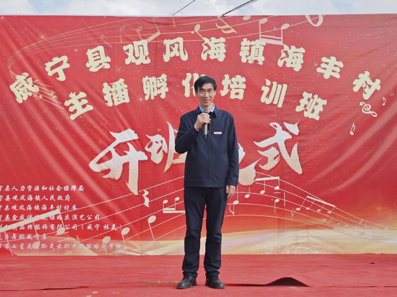 勒系琳在开班仪式上作发言。他说,贵州工贸职业学院与威宁县观风海镇人民政府在2024年签订了《农产品线上出山》协议,当时双方商定贵州工贸职业学院利用学校在教育、人才培养以及线上平台搭建等方面的优势;观海镇人民政府利用自己在农产品生产和供应方面的丰富经验,双方共同推动农产品线上出山,助力乡村振兴,帮助当地农民增收。