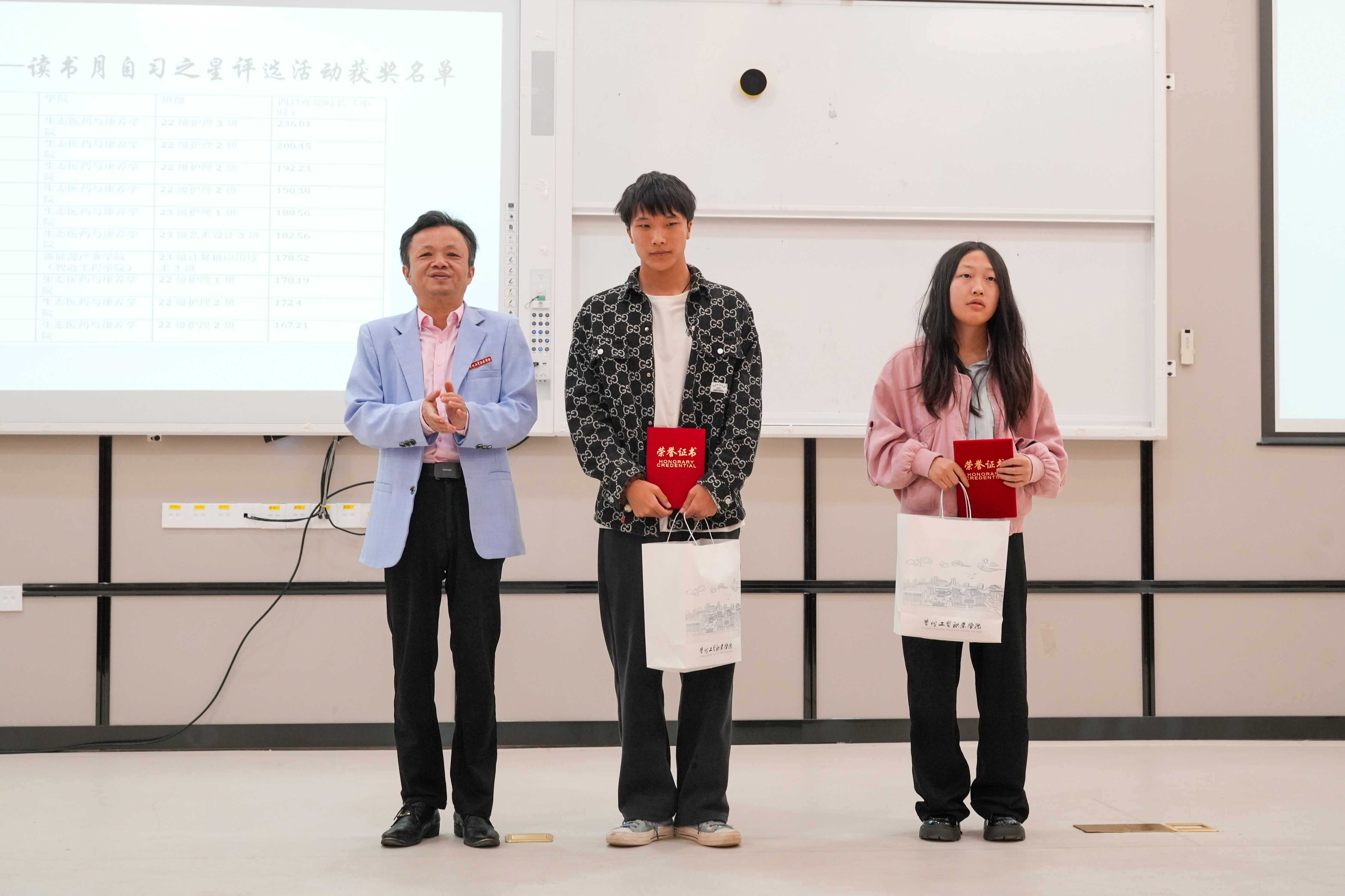 聂立新颁发一等奖熊力莉宣读读书月阅读之星、自习之星评选活动获奖名单
