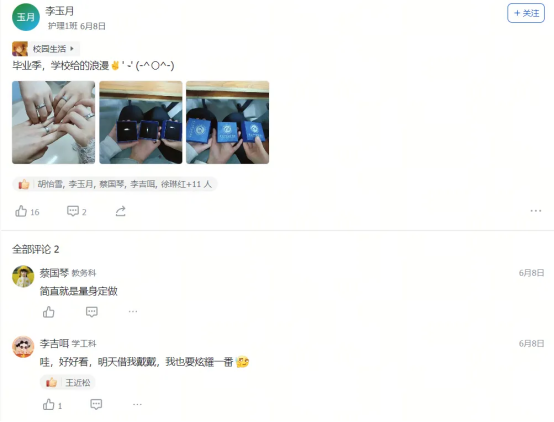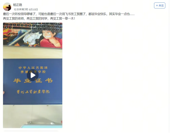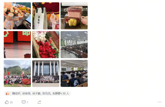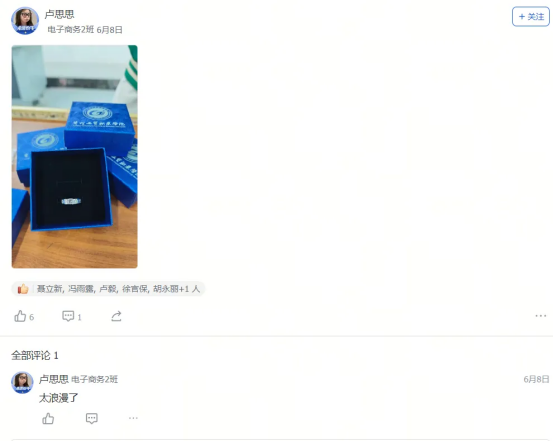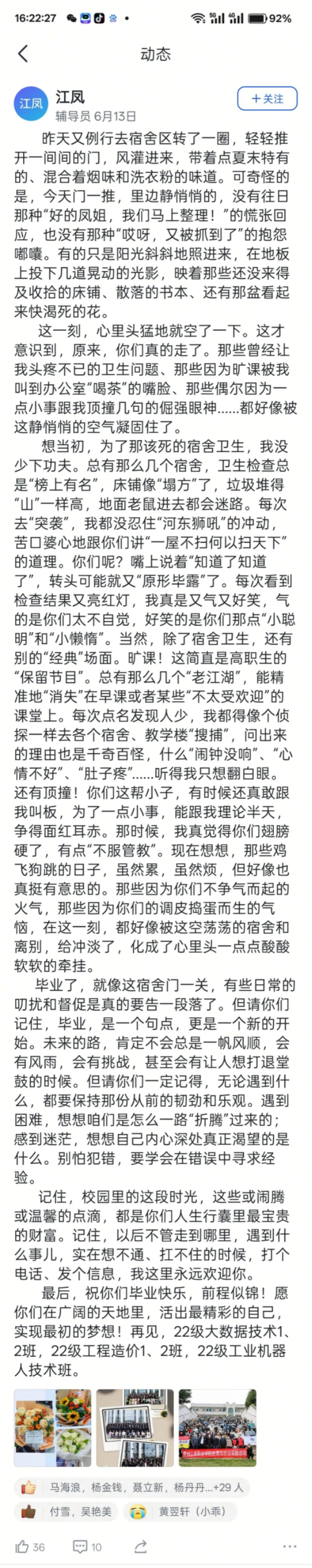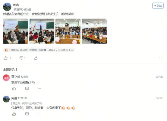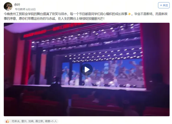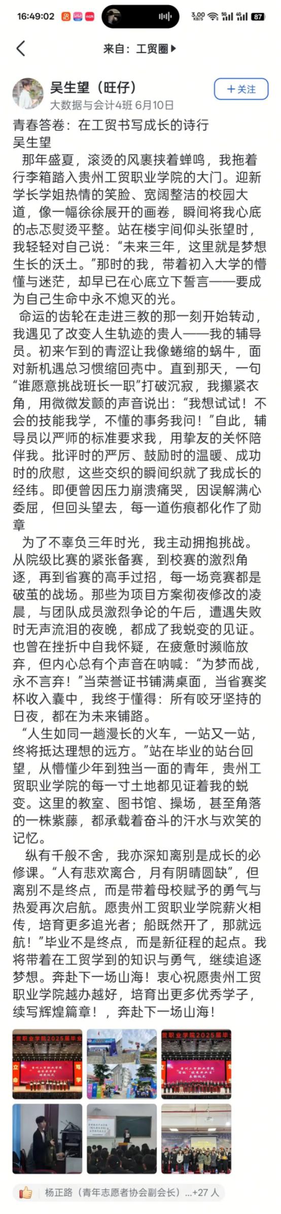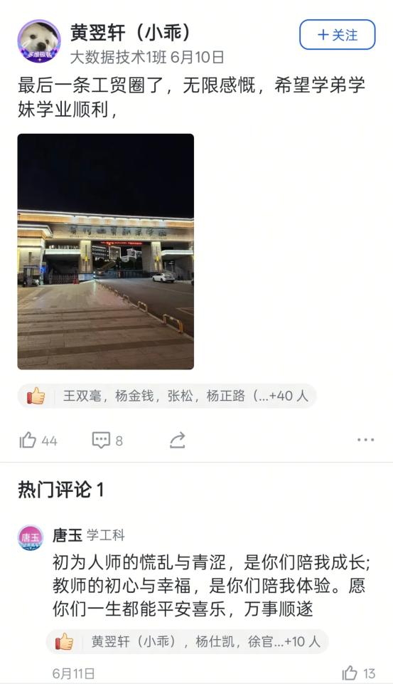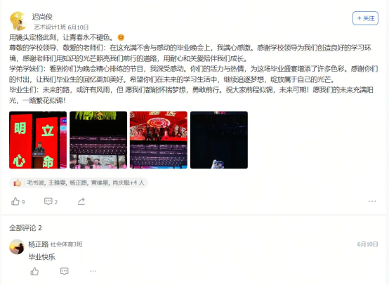艺术设计1班的迟同学在毕业晚会后飞书工贸圈的深情致谢,大数据技术1班的黄同学发出的“最后一条工贸圈,无限感慨,祝学弟学妹们学业顺利!”及其评论区里唐玉老师“初为人师的慌乱与青涩,是你们陪我成长”的动情回应……这一条条动态,一声声祝福,一幅幅定格在飞书工贸圈里的鲜活画面与肺腑之言,早已超越了简单的社交分享。它们无声地串联起散落天涯的思念,凝聚成贵工贸这个大家庭最温暖、最坚韧的情感纽带。在这个注定要各自远航的夏天,工贸圈成为盛放离愁别绪、传递无尽祝福的云端港湾,让“贵州工贸职业学院永远是你们的家”这句承诺,有了触手可及的温度与回响。