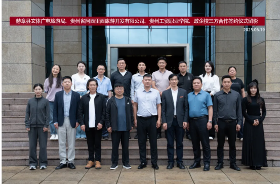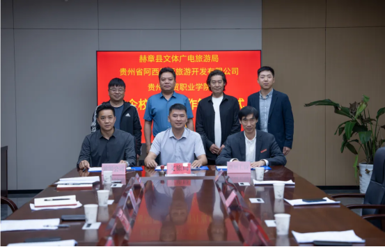 6月19日,赫章县文体广电旅游局、贵州省阿西里西旅游开发有限公司、贵州工贸职业学院在赫章县举行政校企三方合作签约仪式。赫章县委宣传部副部长孙大权,赫章县文体广电旅游党组书记、局长王浩波,贵州省阿西里西旅游开发有限公司党委书记、董事长徐勇,贵州省阿西里西旅游开发有限公司党委副书记、总经理徐斌,赫章县文体广电旅游党组成员、副局长杨萍,赫章县文体广电旅游党组成员、副局长赵云,赫章县文体广电旅游副局长文元;贵州工贸职业学院党委委员、常务副校长勒系琳,艺术学院院长周正军等参加活动。签约仪式由孙大权主持。