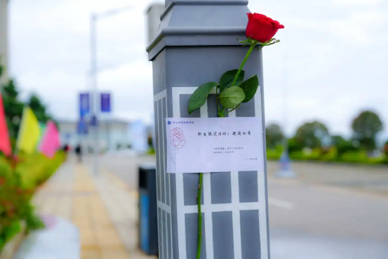 活动当天,图书馆精心布置校园环境,在校园内张贴玫瑰花与青春励志的标语,传递奋斗与希望的力量。同时,志愿者们将一枝枝象征美好与祝福的玫瑰花送到新生手中,花香与笑颜交织,让新同学在初入校园的第一时间就感受到来自学校的关怀与温暖。