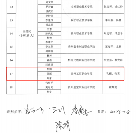 4月8日,2023年贵州省高职院校技能大赛“大数据技术与应用”赛项,在贵州轻工职业技术学院顺利举行。智造工程分院21级计算机应用技术专业、大数据技术专业胡博、苏瑶、陈豪三位同学在孔蝶、张雪老师的悉心指导下获该赛项三等奖。