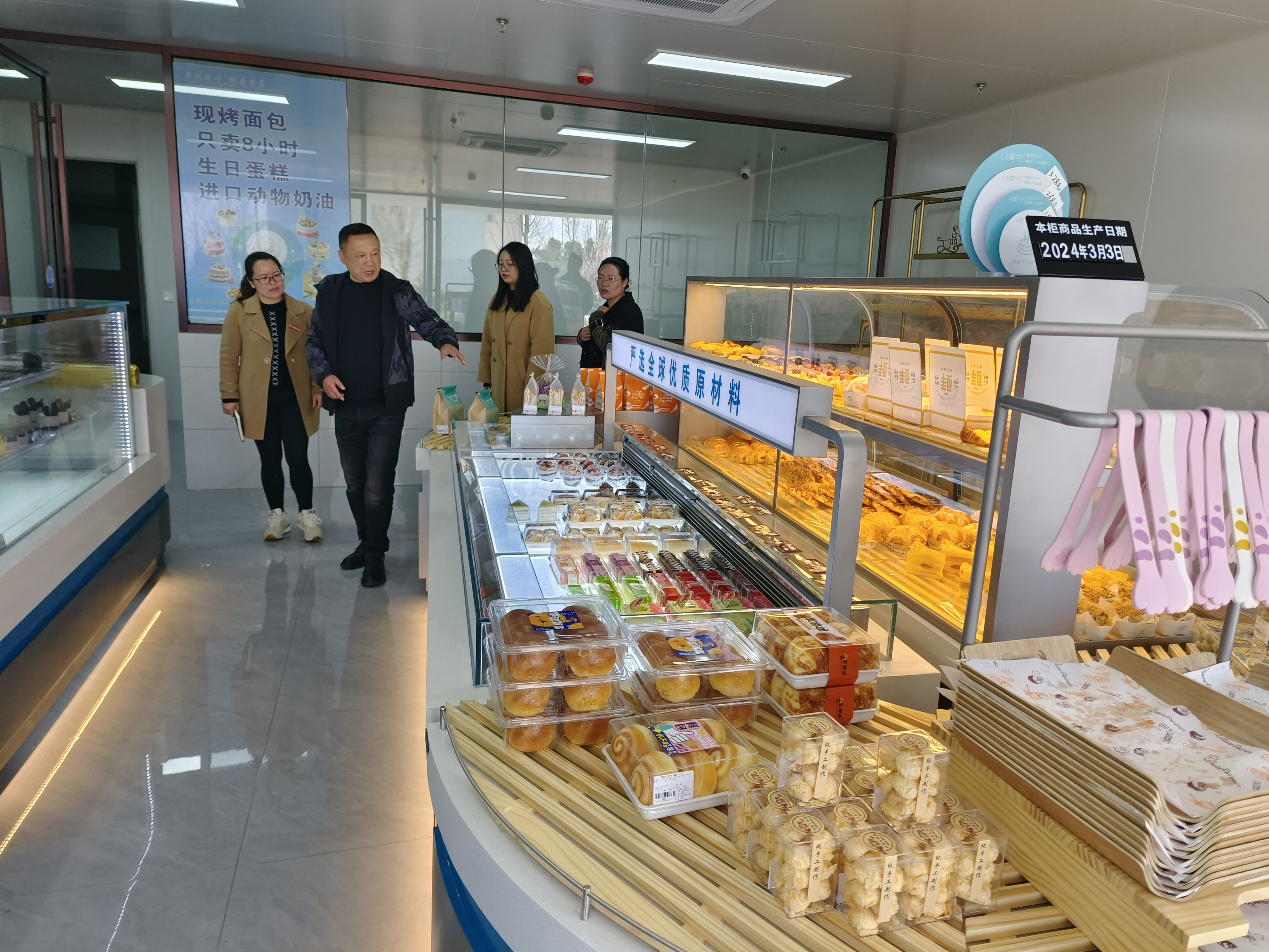 图为杨一梅及食品专业教师到一品鲜烘焙食品体验中心查看刚生产的各类糕点,并了解烘焙过程及使用原料。同李总探讨了即将开展《焙烤食品加工技术》课程学生观摩实训课的相关工作准备。