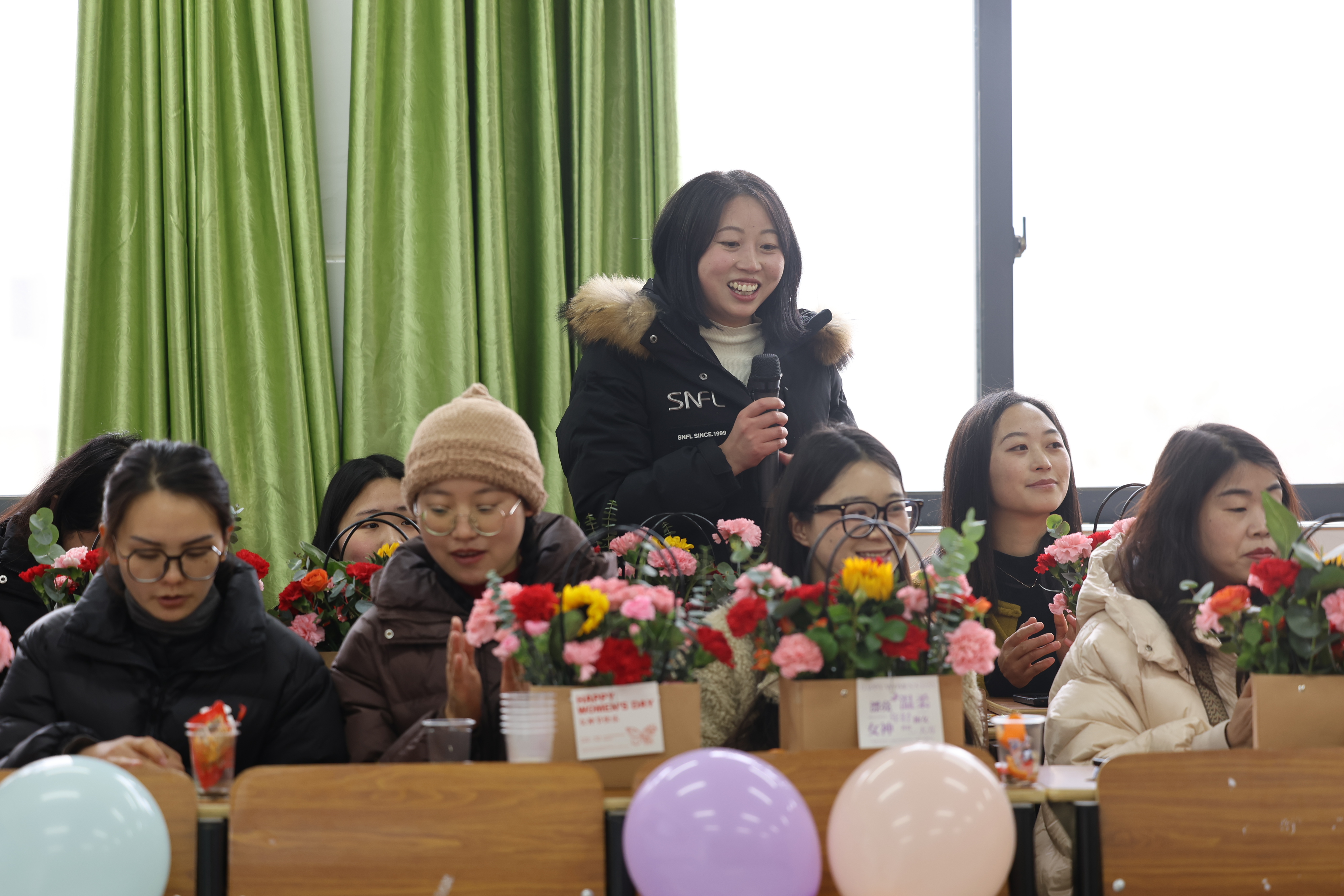 随后,学生代表上台为女教师们献花,表达了对他们长期以来关心和支持女性师生的感激之情。同时,学生们还献上了精心准备的歌曲,歌声悠扬,旋律动人,赢得了在场人员的阵阵掌声。