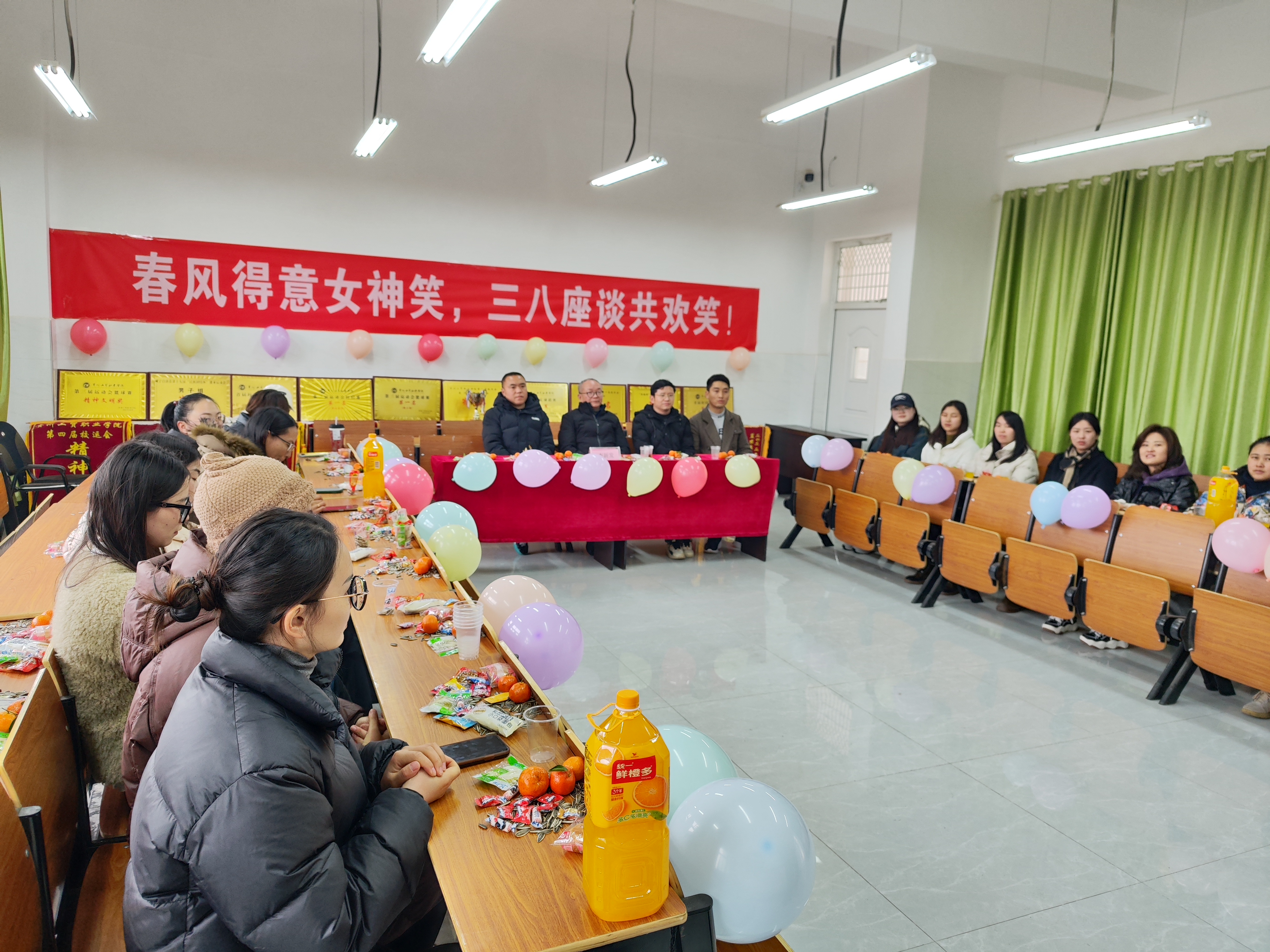 3月8日,为庆祝国际劳动妇女节,我院隆重举行了“三八”妇女节座谈会。此次活动由学工、教务和学生会共同筹备,旨在为全体女性师生提供一个交流心得、分享经验的平台,共同庆祝女性在教育、社会等各个领域的杰出贡献。活动当天,我院学工科、教务科和院学生会的工作人员早早地开始了会场的布置工作。会场上,色彩缤纷的气球、精心挑选的横幅以及温馨的标语,都透露出对女性师生的深深敬意和节日的喜悦。特别值得一提的是,由李安维老师负责采购的鲜花和用品,更是为会场增添了一抹别样的芬芳和色彩。