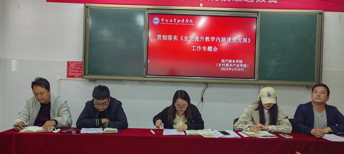 根据校领导关于《贯彻落实全校教学工作会议精神》指示安排,4月30日下午,现代商务学院(乡村振兴产业学院)组织全院教职工在3教东区307会议室召开贯彻落实《全面提升教学内涵建设发展》工作专题会。会议由现代商务学院(乡村振兴产业学院)副院长杨一梅主持。
