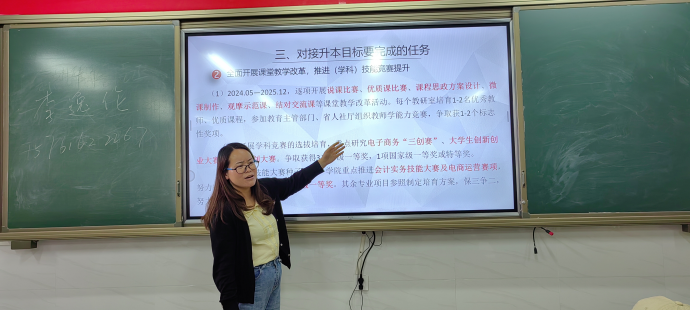 会议伊始,杨一梅带领全院教职工对学校全面提升教学内涵建设发展指标进行了关键点解读,对标升本指标,从五个方面明确学院要完成的建设任务:一是补齐师资队伍结构性差距;二是全面开展课堂教学改革,推进学科(技能)竞赛成果培育;三是夯实实训教学基础,加强校企合作共建专业力量;四是制定管理办法,促成教科研成果的孵化;五是凝练学院特色,形成专业品牌。杨院长再次向全院教师重申了内涵建设的重要性,要求老师们提高认识、主动思考、积极行动、扎实做好各项工作。