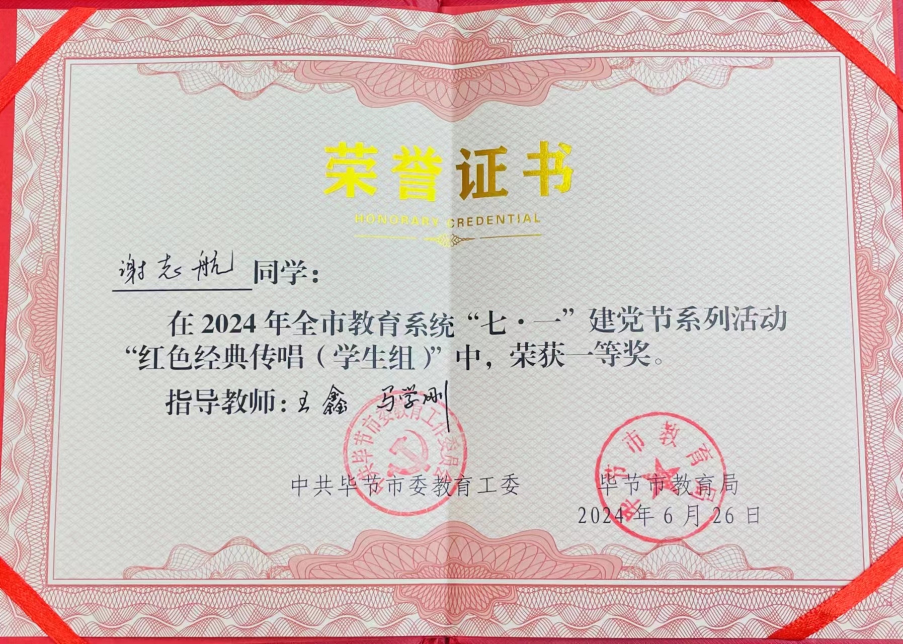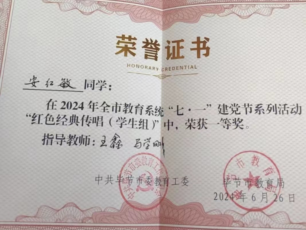 6月26日,在中共毕节市委教育工委、市教育局举办的2024年毕节市教育系统“七一”建党节系列活动“红色经典传唱大赛(学生组)”中,贵州工贸职业学院艺术学院音乐专业学生谢志航、张乃馨、舞蹈专业学生安红敏参加的曲目《万疆》在比赛中脱颖而出,荣获一等奖!贵州工贸职业学院获得“优秀组织奖”!