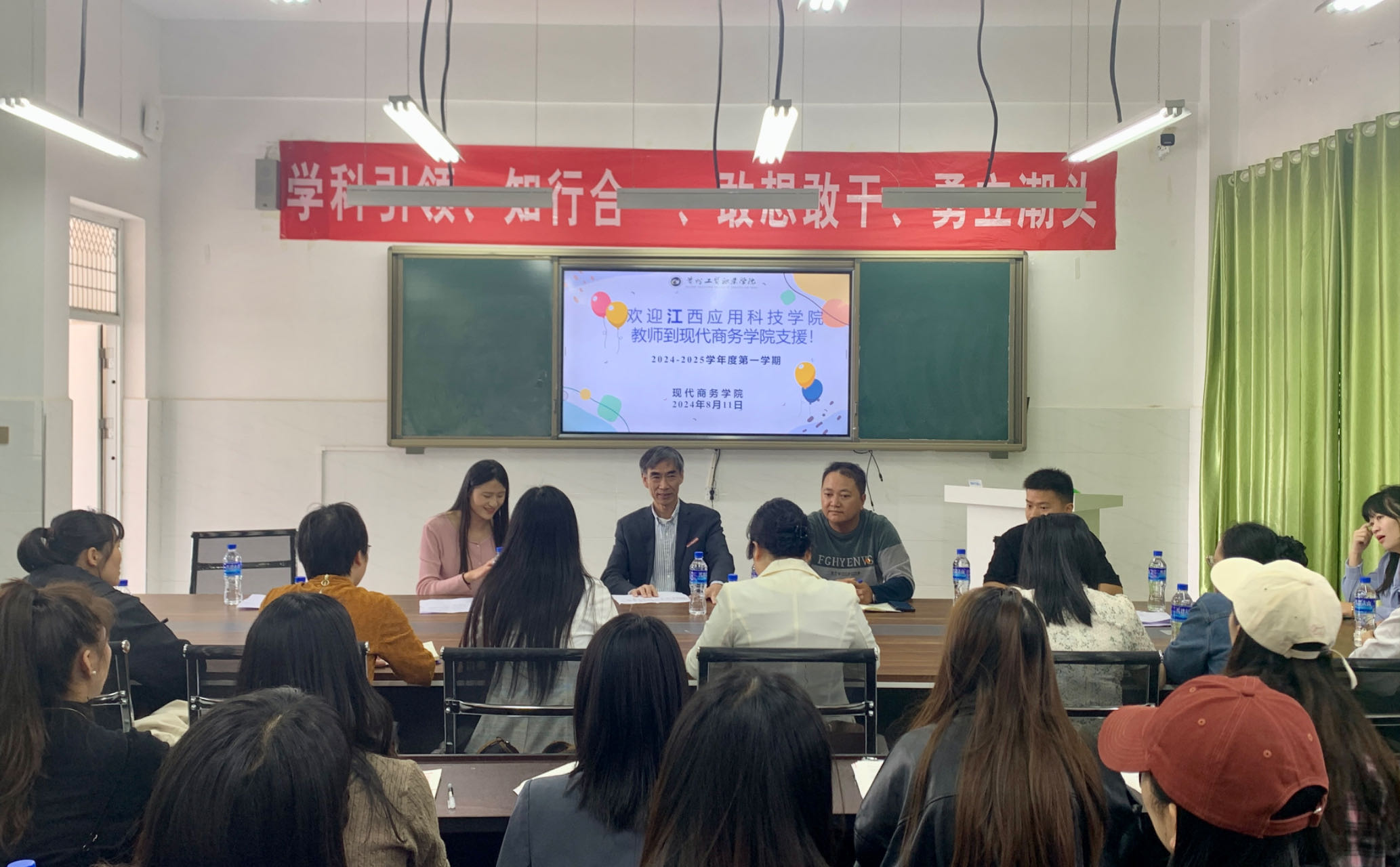 在深化教育合作、促进教育资源均衡发展的背景下,为进一步提升贵州工贸职业学院教学质量与师资水平,江西应用科技学院选派了一批优秀的专家、教授团队前往贵州工贸职业学院现代商务学院(乡村振兴产业学院),开展为期一个月的教学帮扶支援工作。此次活动旨在通过交流互鉴、资源共享,助力贵州工贸职业学院现代商务学院(乡村振兴产业学院)打造高素质的教师队伍,推动学院教育教学改革与发展。同时,也标志着两校在深化合作、共谋发展上迈出了坚实的一步。8月11日下午,现代商务学院在三教东区307会议室举办江西应用科技学院优秀教师赴我院教学工作见面会。校党委委员、副校长、勒系琳,学院党支部书记胡潇,办公室主任袁优及全院教职工、江西应用科技学院优秀教师参会,会议由袁优主持。