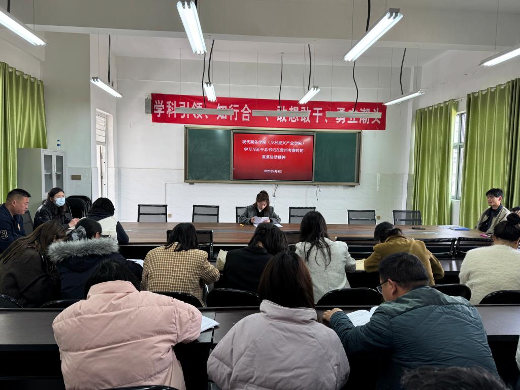 为深入学习贯彻习近平总书记2025年3月17日至18日在贵州考察时的重要讲话精神,现代商务学院(乡村振兴产业学院)4月8日组织全体教职工召开专题学习会议,结合学院职能与乡村振兴实践,切实将讲话精神转化为推动学院高质量发展、服务乡村振兴战略的行动指南。本次会议由现代商务学院党支部组织委员崔香伶主持。