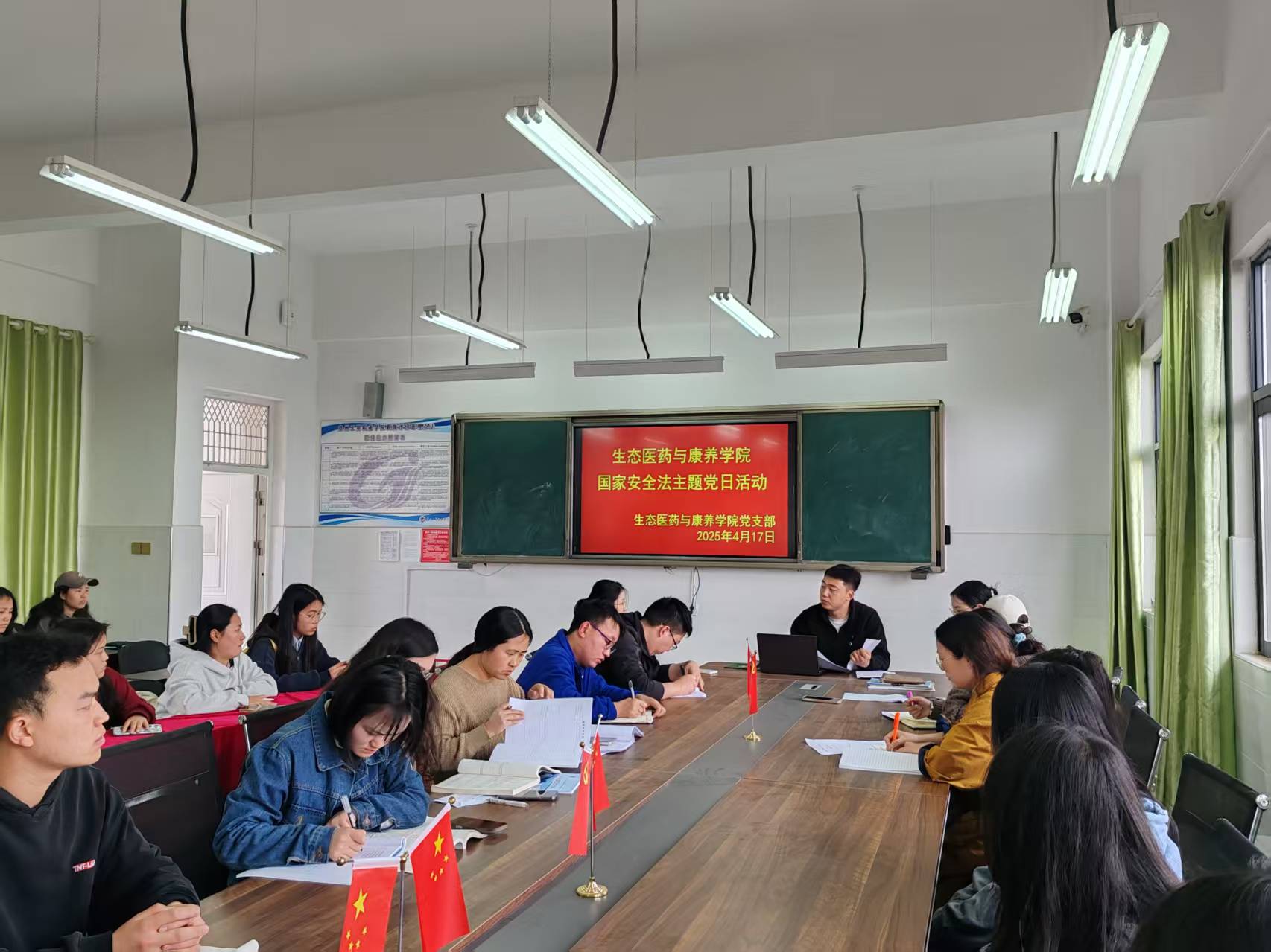 为深入学习总体国家安全观,强化党员师生的国家安全意识与责任担当,4月17日,生态医药与康养学院在三教东区110会议室开展“筑牢国安防线,医养先锋先行”主题党日活动。党支部书记赵英涛、全体党员及积极分子参加,共上国家安全“必修课”。