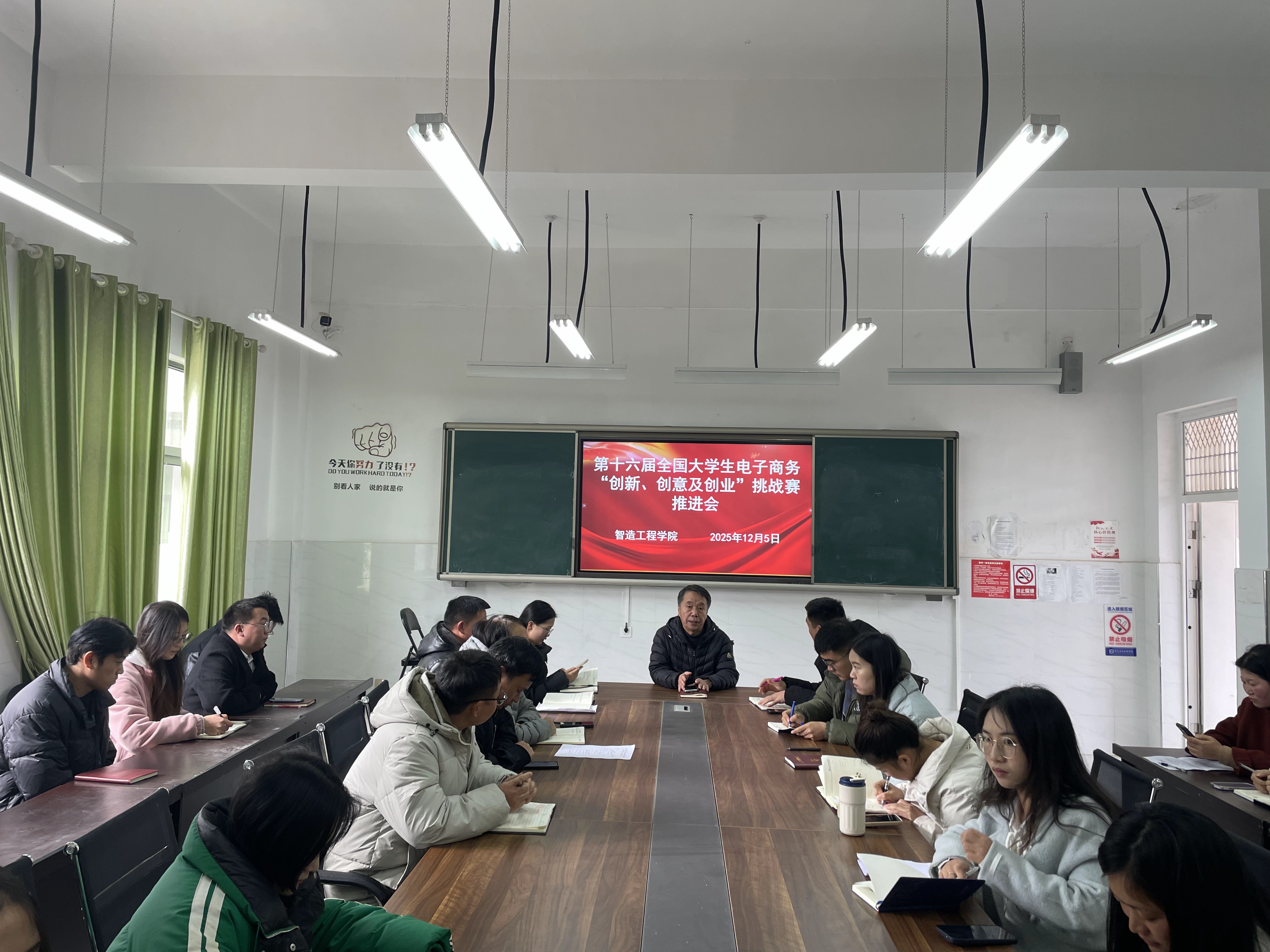 为全面推进第十六届全国大学生电子商务“创新、创意及创业”挑战赛(以下简称“三创赛”)校级选拔赛的筹备工作,凝聚全院力量激发学生创新创业热情,于12月5日上午,智造工程学院(新能源产业学院)召开“三创赛”专题工作部署会。会议由学院院长黄乾贵主持,学院各科室全体人员、全体教师及辅导员参加会议。