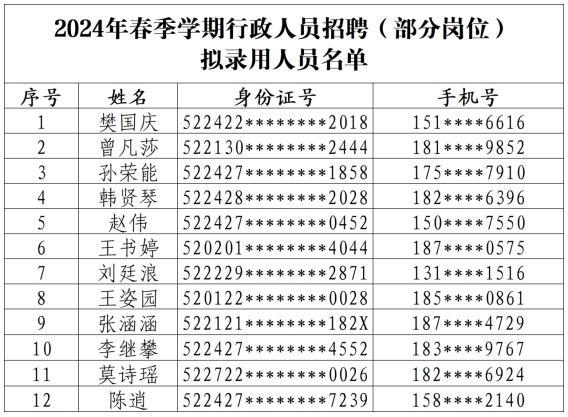 根据《贵州工贸职业学院2024年春季学期行政人员招聘公告》要求,经简历筛选、面试、综合评价,学校研究决定,拟聘用以下同志到我校工作,现予以公示: