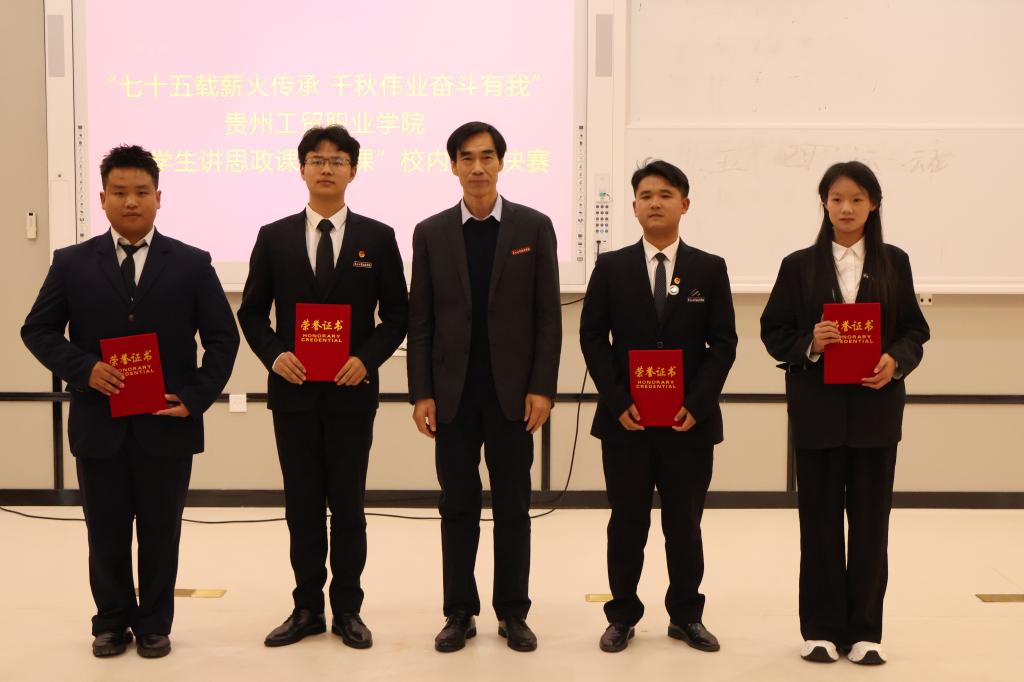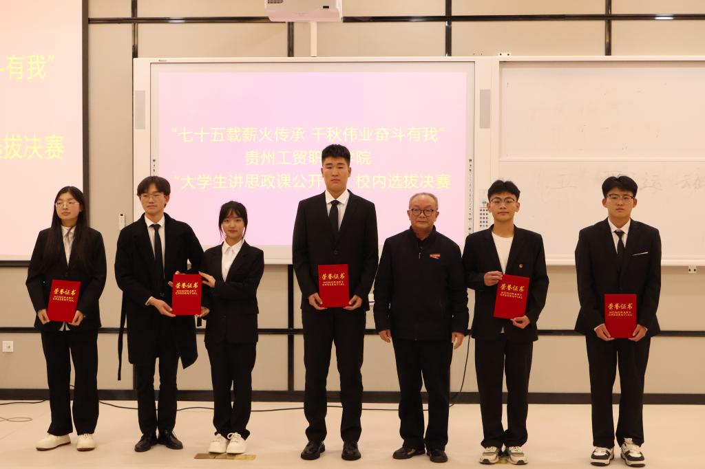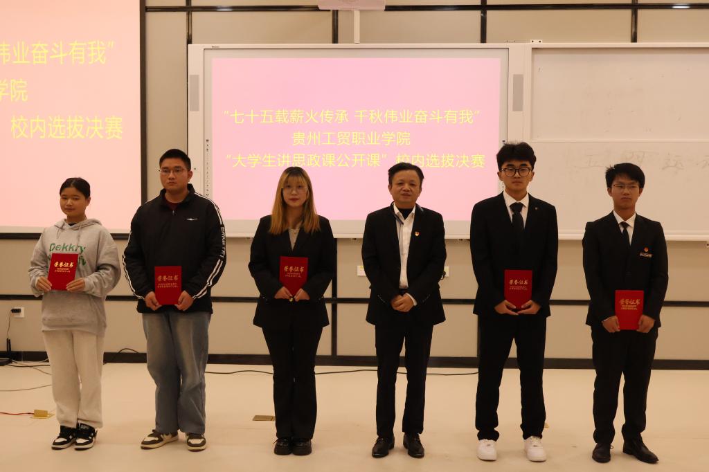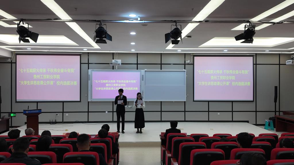 近日,贵州工贸职业学院开展以“七十五载薪火传承 千秋伟业奋斗有我”为主题的大学生讲思政课公开课展示活动大赛。来自全校的24支团队报名参赛,最终14支学生团队进入决赛。