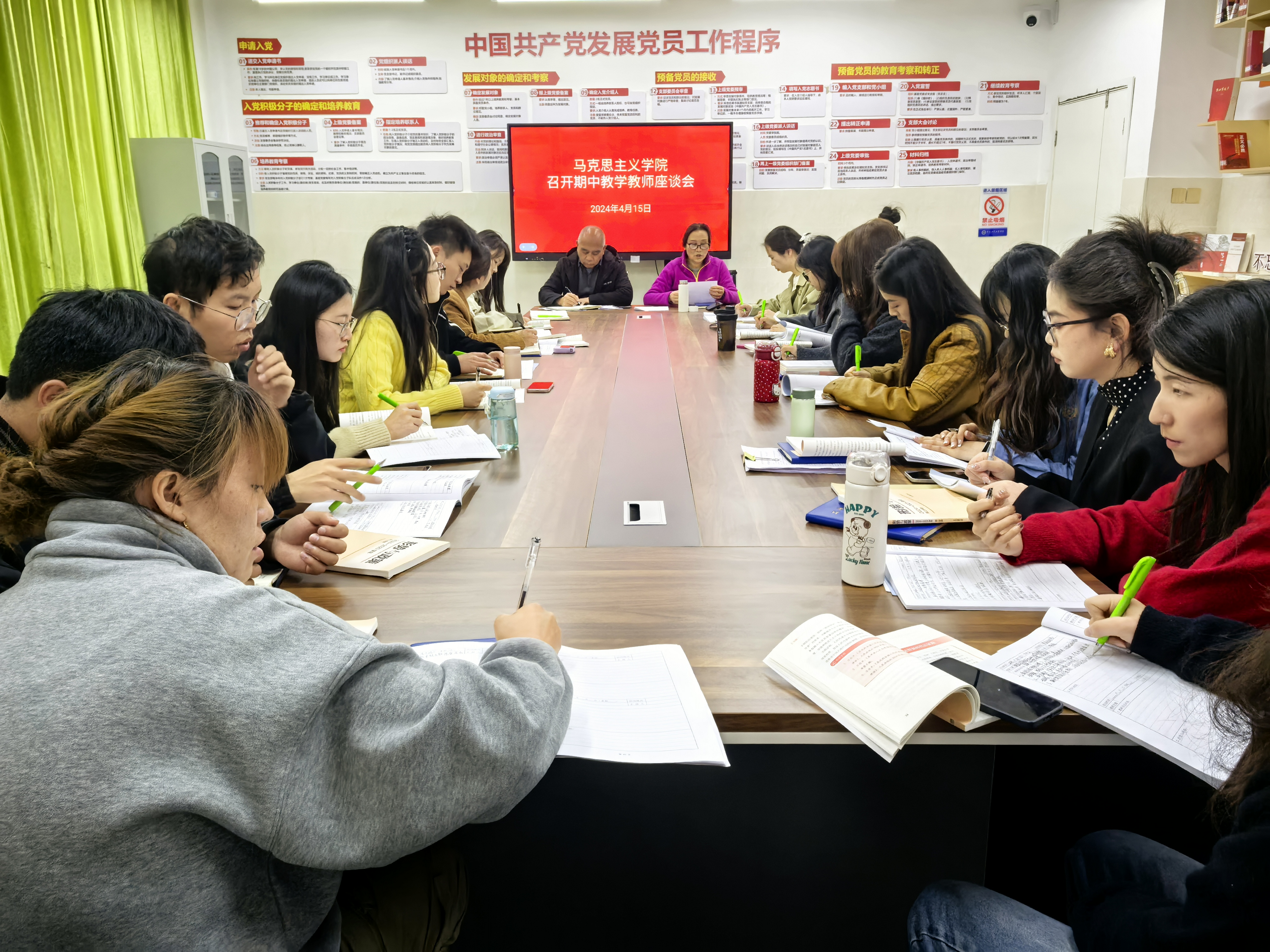 为深入贯彻落实新时代高校思政课建设要求,持续提升思想政治理论课教学质量,精准对接学生需求,5月15日下午,马克思主义学院组织召开2025年春季学期期中教学反馈教师座谈会和学生座谈会。院长邓天丽、党支部书记李加茂及全体教师及学生代表共40余人参会。围绕课程建设、教学方法、实践创新等展开深入交流。