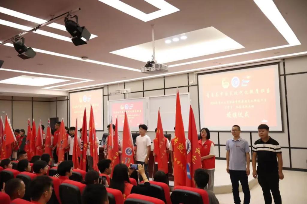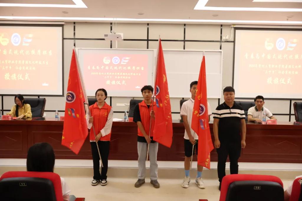 智造工程学院(新能源产业学院)院长焦益群、生态医药与康养学院负责人王方对、现代商务学院(乡村振兴产业学院)负责人袁优、国防教育与体育学院负责人陈蓓、校团委负责人江燕虎为我校省级专项团队代表授旗。