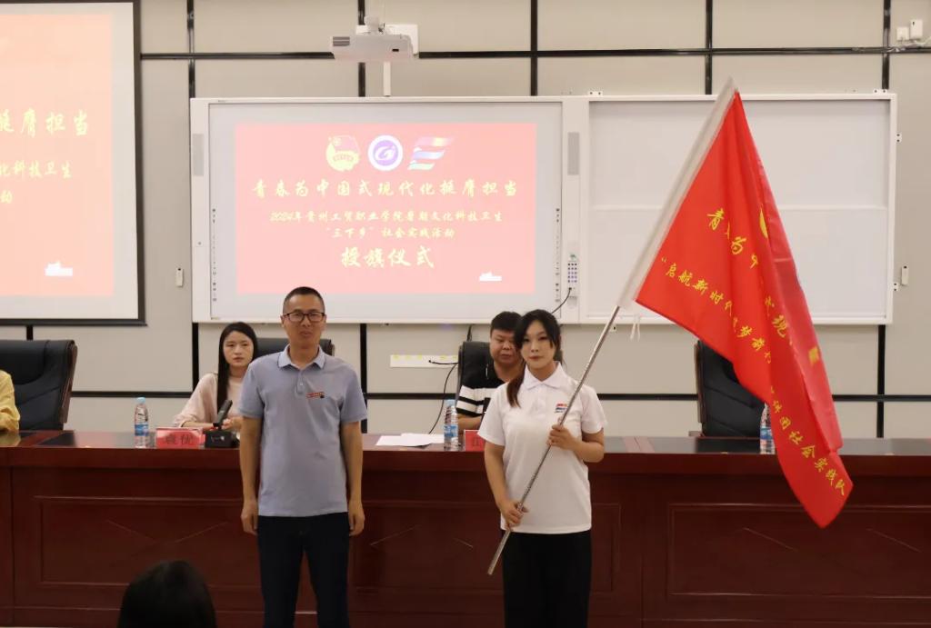 为深入学习宣传贯彻习近平新时代中国特色社会主义思想,全面贯彻落实党的二十大精神,切实发挥共青团作为广大青年在实践中学习中国特色社会主义和共产主义的学校作用,引导和帮助广大青年学生在与现实相结合的“大思政课”中“受教育、长才干、作贡献”,引领学生立志做有理想、敢担当、能吃苦、肯奋斗的新时代好青年。8月8日,我校在图书馆负一楼报告厅举行2024年贵州工贸职业学院“青春为中国式现代化挺膺担当——大学生暑期文化科技卫生“三下乡”社会实践活动出征仪式。参加今天出征仪式的有校团委全体教职工、各二级学院负责人、团总支负责人、各实践团队指导老师、队员共计280余人。仪式由校团委负责人江燕虎主持。