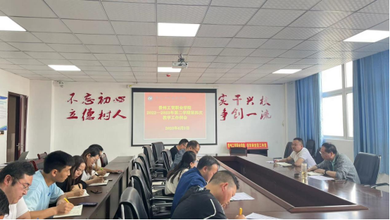 首先,教务处长对5月份相关工作作出汇报:并安排下一步工作计划。即5月份工作完成情况:完成2022—2023学年度第二学期教师教学能力竞赛;启动《贵州工贸职业学院校级教学科研课题管理办法》申报工作;完成22级学生用书及教师用书的征订;完成国家级、省级教育科学规划课题和教育科学研究优秀成果的评选及相关资料的上报;完成毕节市高技能人才的上报;根据《省教育厅办公室关于做好2023年职业教育活动周相关工作的通知》,完成技能活动周相关工作。