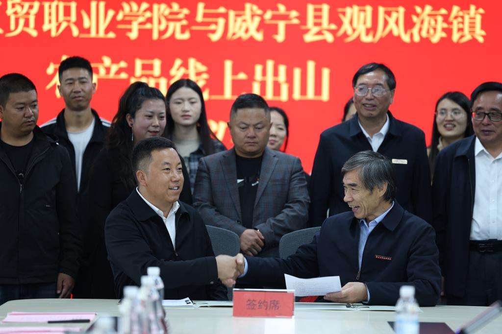 9月25日,贵州工贸职业学院与威宁县观风海镇举行农产品线上出山签约仪式。贵州工贸职业学院校党委副书记、校长李建萍,校党委委员、副校长勒系琳,现代商务学院(乡村振兴产业学院)院长熊器及教师代表;威宁县观风海镇副镇长马勋杰,农业服务中心主任锁龙全,村支两委及驻村干部参加签约仪式。