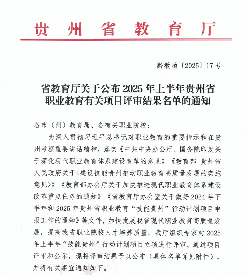 近日,贵州省教育厅办公室公布2024年贵州省职业教育优秀典型案例评选结果,贵州工贸职业学院申报的《毕节新能源市域产教联合体》案例成功入选“省级市域产教联合体项目立项名单”。