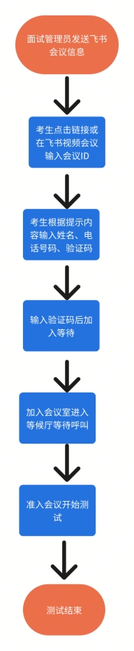 由面试管理员发送飞书会议信息→参加网络测试的考生根据提示内容输入姓名、电话号码和验证码→输入验证码后确认入会等待(具体操作见附件图示)
