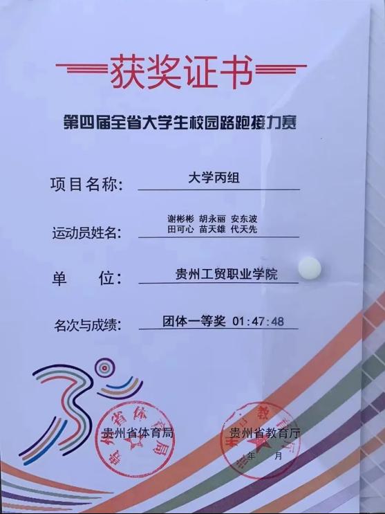 为贯彻落实中共中央办公厅、国务院办公厅《关于全面加强和改进新时代学校体育工作的意见》和国家体育总局、教育部《关于深化体教融合促进青少年健康发展的意见》,推动我省千万师生阳光体育运动蓬勃开展,省体育局、省教育厅9月28日在贵州大学举行“奔跑吧•少年”第四届全省大学生校园路跑接力赛。我校学子在此次活动中获得高职高专组全省个赛第二名、团体一等奖!