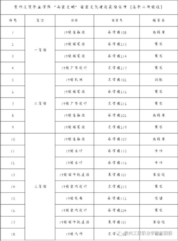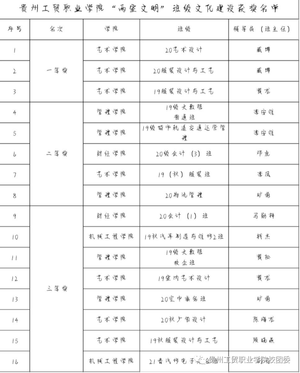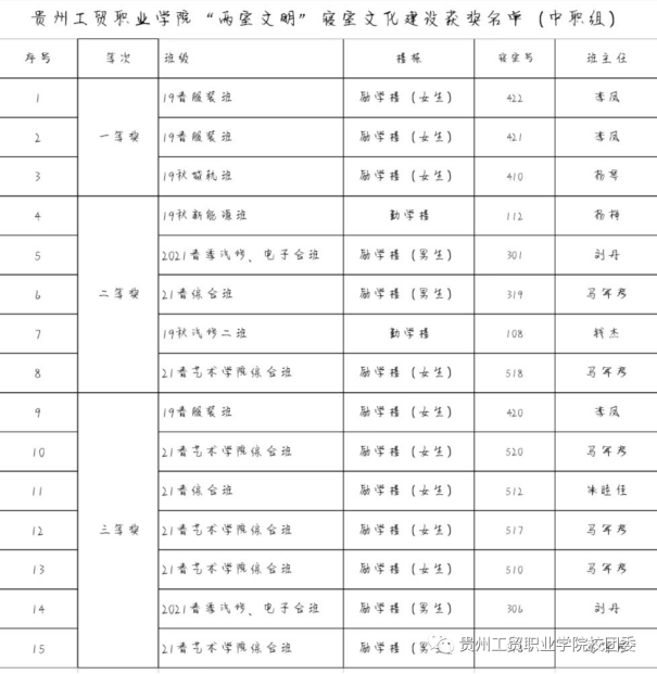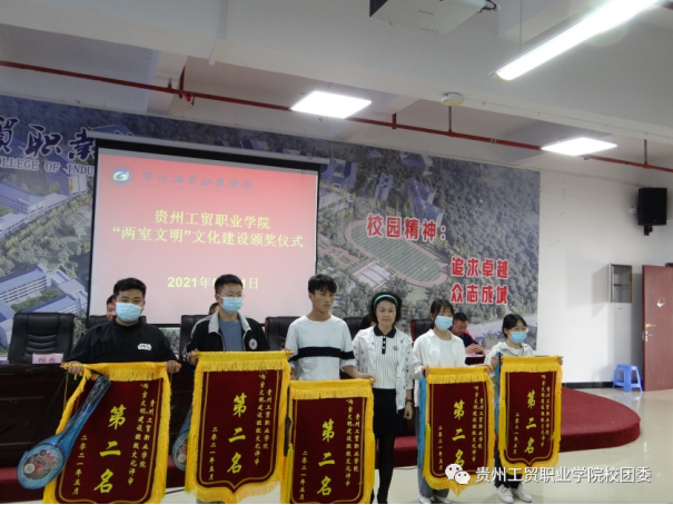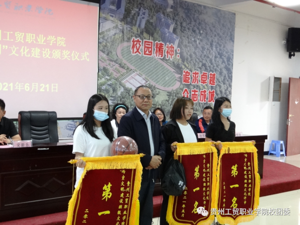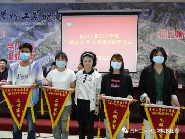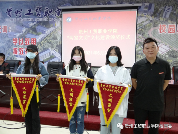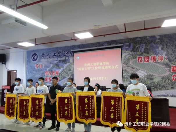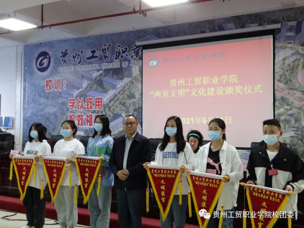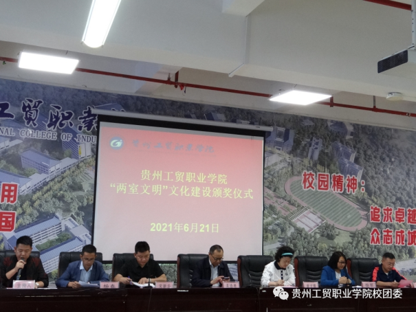 6月21日下午16:00,我校在综合楼二楼学术报告厅隆重举行贵州工贸职业学院“两室文明”文化建设颁奖仪式。出席本次仪式的领导有:学校执行校长吴浩亮,常务副校长黄文霞,副校长宋新乐,学工处处长杨金钱,就业办主任兼学工处副处长杨琴,总务处副处长杨超,学工处副处长杨春。本次颁奖仪式由杨金钱处长主持。