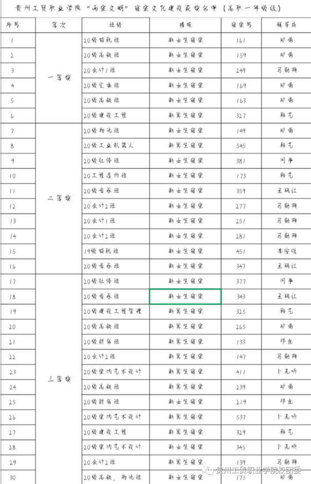 在校领导的大力支持下,全校师生共同参与,历时两个多月的“两室文明”文化建设活动终于在今天落下帷幕,本次活动共评选出班级文化建设一等奖3名、二等奖5名、三等奖8名;高职一年级组寝室文化建设一等奖6名、二等奖10名、三等奖14名;高职二年级寝室文化建设一等奖4名、二等奖5名、三等奖9名;中职组寝室文化建设一等奖3名、二等奖5名、三等奖7名。