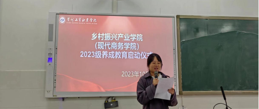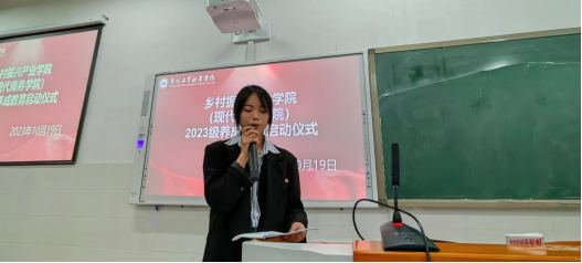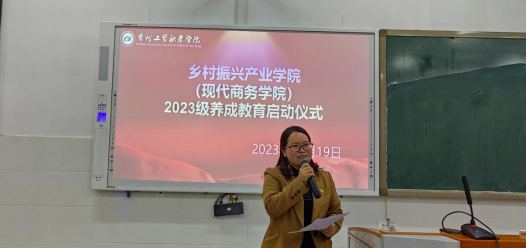 杨一梅做总结发言,并宣布贵州工贸职业学院乡村振兴产业学院(现代商务学院)2023级养成教育动员大会正式启动。她表示,好习惯决定好性格,好性格决定好人生,养成是一个过程,需要在时间和空间上不断积累,贵在坚持,进而形成自然。大学生自我养成良好的修为,要从自己做起,从现在做起,从课堂学习、自我学习、食宿生活、考试参会、运动场和校内外的各种场所的点滴做起,从一言一行做起。接着,她通过分享座右铭“无论你过去是成功还是失败,那都已成为过去,重要的是把握现在,成就未来!”与同学们产起共鸣,进一步强调了素养教育对同学们的重要性。