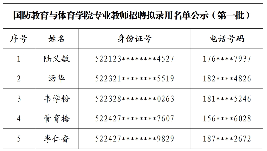 根据《贵州工贸职业学院国防教育与体育学院专业教师招聘公告》要求,经简历初筛、面试(试讲)、综合评价,学校研究决定,拟聘用以下同志到我校工作,现予以公示: