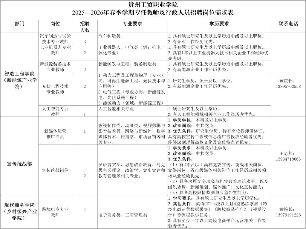 根据工作需要,我校拟面向社会公开招聘专任教师,详见附件:贵州工贸职业学院2025-2026年春季学期专任教师及行政人员招聘岗位需求表。海外院校毕业生取得的学历学位证书应获得国家教育部认证、2025年普通高校应届毕业生未取得毕业证书、学位证书的可先行报名及笔试、面试,经笔试、面试、体检、考察、公示并于2025年12 月 31 日之前取得毕业证书、学位证书的,可按规定聘用,否则不予聘用。