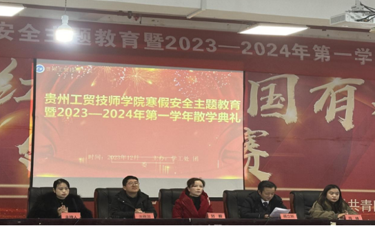 伴随着冬季的脚步,承载着辛勤耕耘的喜悦,在全体师生的共同努力下,贵州工贸技师学院紧张忙碌的2023—2024学年第一学期即将结束。为了给本学期的学习之旅划上一个完美的句号,12月22日上午,在综合楼二楼草海大讲堂举行了“寒假安全主题教育暨2023—2024学年第一学期散学典礼”,典礼在雄壮的国歌声中拉开帷幕,仪式庄严肃穆。贵州工贸职业学院党委副书记聂立新、贵州工贸技师学院执行院长刘毅、学工处副处长朱姝淑、教务处副处长周婧、行政人员及全体班主任、学生参加了散学典礼。