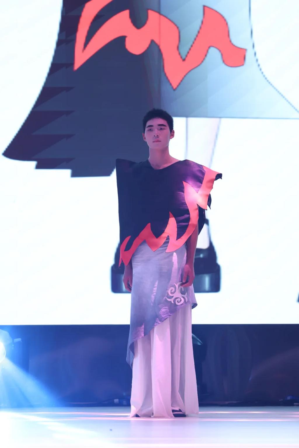 舞台上,模特们身着融合非遗元素与现代创意的服饰依次登台,为观众带来一场视觉盛宴。这些作品充分展现彝族、回族、苗族等民族的文化特色,彝族服饰中的羊角纹、蕨纹、火纹等传统纹样,象征着力量、希望与对火的崇敬;回族服饰的简约内敛与植物纹样,体现独特的民族气质;苗族蜡染工艺及蝴蝶、凤凰等图腾,承载着深厚的文化底蕴与美好寓意。