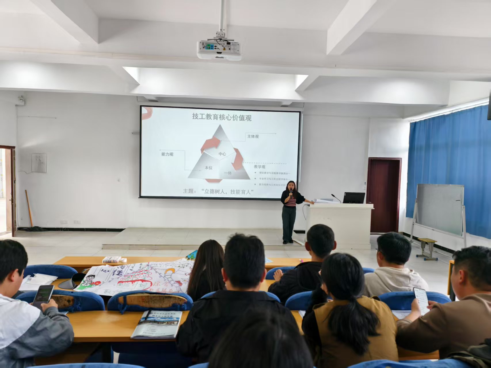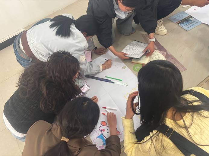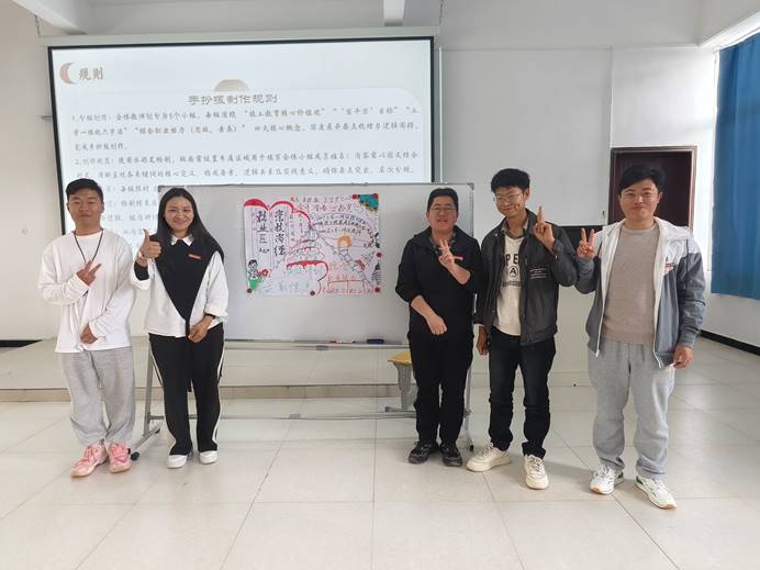 活动伊始,26名教师打破学科界限组成4个小组围绕"技工教育核心价值观"'百千万'目标"工学一体化六步法"综合职业能力培养"四大命题绘制手抄报,在教务处处长周婧"以视觉化思维重构教育逻辑"的理念引导下,各小组需在60分钟内完成包含概念解析、要素拆解、逻辑建构及实践路径的创意手抄报,并以团队答辩形式进行成果展示。
