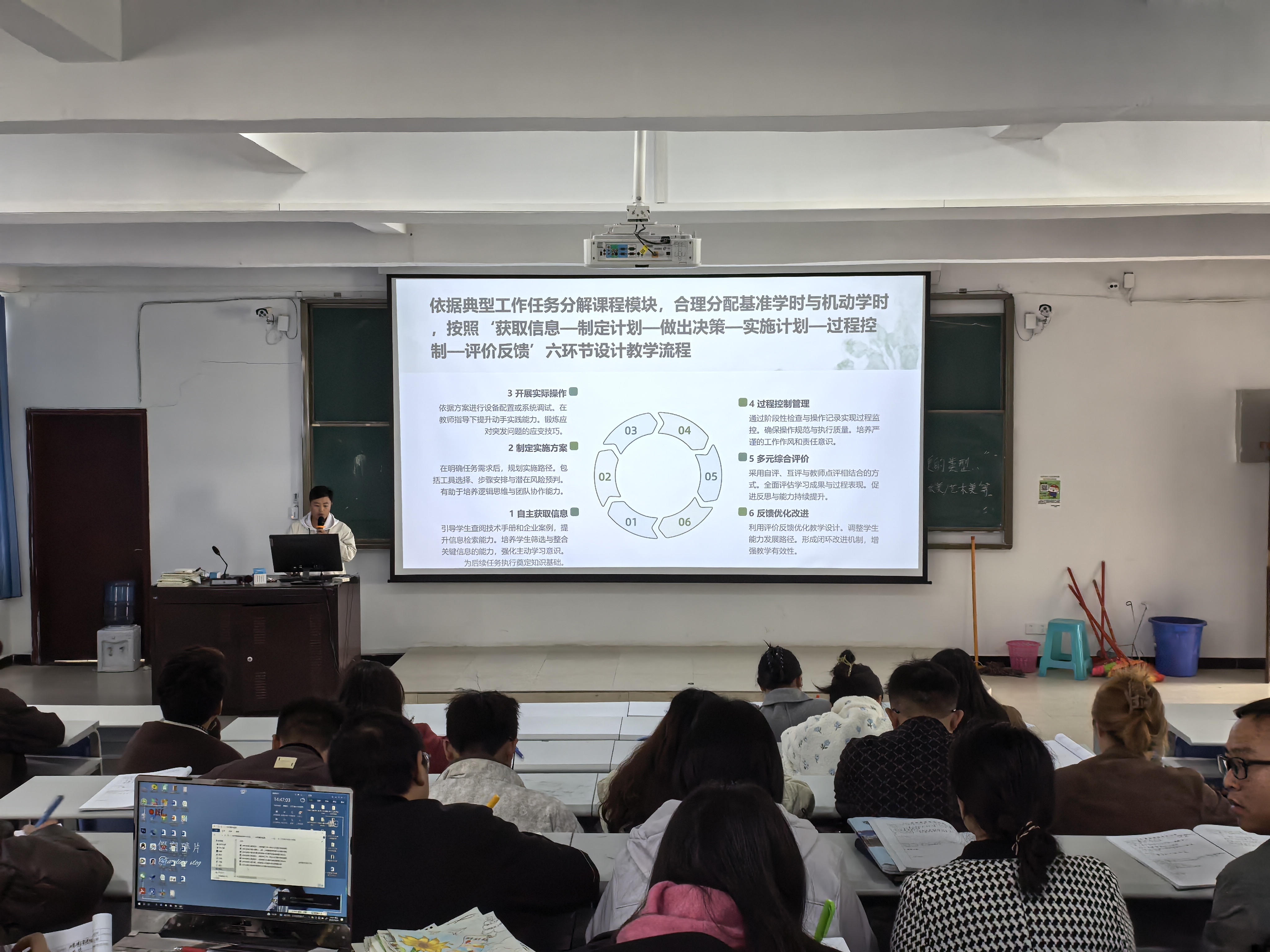 活动伊始,胥春老师结合其参加工学一体化培训的深刻体悟,做了开篇分享。他不仅精准解读了一体化教学的核心内涵,更通过对比传统教学模式的差异,生动阐述了如何将“学生中心、能力本位”的教育理念从宏观理论落实到微观的课堂教学设计中,为在座教师打开了如何将“工”与“学”无缝衔接的全新思路,奠定了本次活动的理论基石。率先分享了参加工学一体化培训的深刻体会,为本次活动奠定了“学以致用、知行合一”的坚实基调。