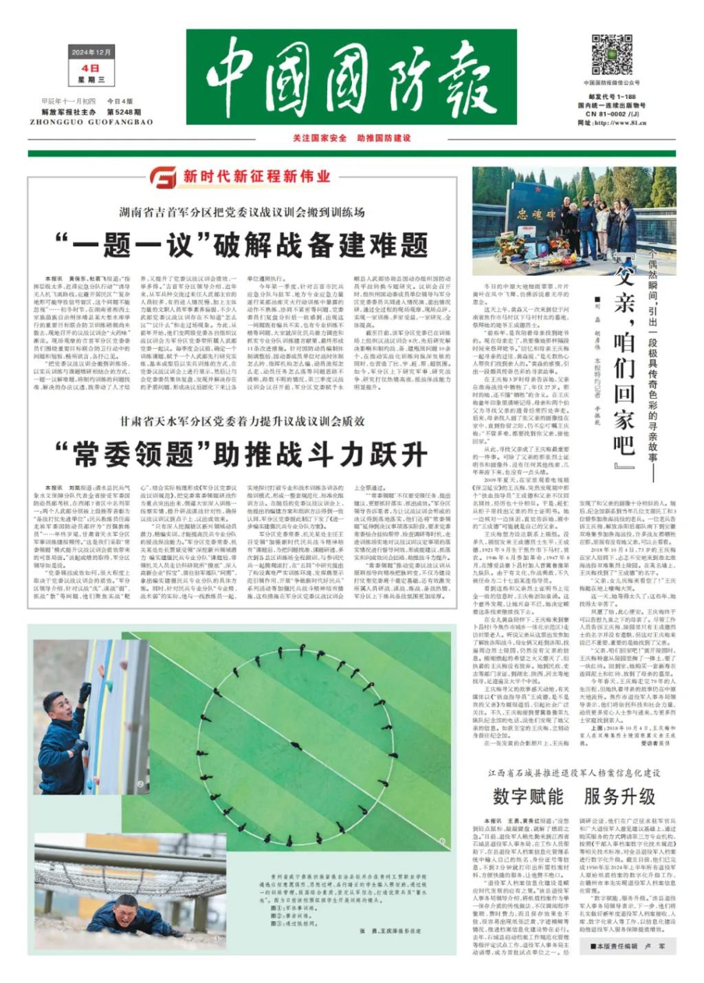 12月4日,《中国国防报》头版报道贵州工贸职业学院高原预征班。报道指出:贵州省威宁彝族回族苗族自治县征兵办在贵州工贸职业学院遴选应征意愿强烈、思想过硬、品行端正的学生编入预征班,通过统一的训练管理,提...