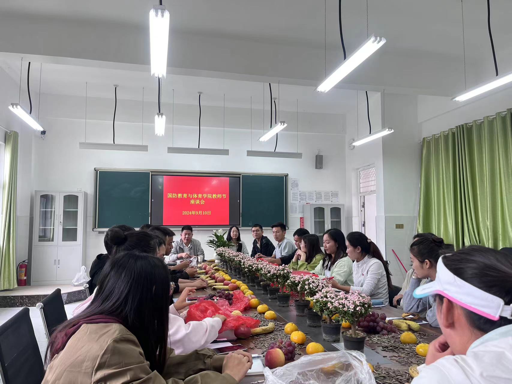 在9月10日这个充满敬意的教师节,国防教育与体育学院于一教 307 会议室成功举办了一场温馨的教师节座谈会。会议室内,一张长桌被精心布置,桌上摆放着新鲜的水果与鲜花,为会议增添了几分节日的喜庆与自然的生机...