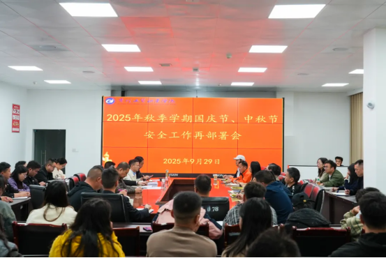 为筑牢校园安全防线,确保全体师生度过平安、欢乐、祥和的假期。9月29日,贵州工贸职业学院在二号教学楼负一楼会议室召开2025秋季学期年国庆、中秋假期安全工作再部署会议。校党委副书记、纪委书记聂立新,校党委委员、副校长宋新乐出席会议,校属各单位负责人、各二级学院学工科科长、辅导员参加会议。会议由保卫处副处长马永全主持。