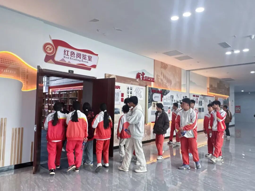 活动伊始,贵州工贸职业学院图书馆工作人员热情接待了研学师生,带领师生依次参观图书馆文化长廊、红色阅览室、自习室等,进行细致全面的讲解。在红色阅览室,师生们驻足观看红色书籍、党史文献、革命先辈事迹展板,近距离感受红色文化的厚重底蕴,重温党的百年奋斗历程,接受深刻的红色精神洗礼。工作人员结合馆藏资源,生动讲述革命故事、传承红色基因,引导同学们厚植爱国情怀、坚定理想信念,让红色血脉在青少年心中代代相传。整洁静谧的自习室、藏书丰富的书库,也让同学们真切感受到浓厚的大学书香氛围,体会到勤学笃行、求知奋进的学习氛围,进一步激发了大家的学习热情。