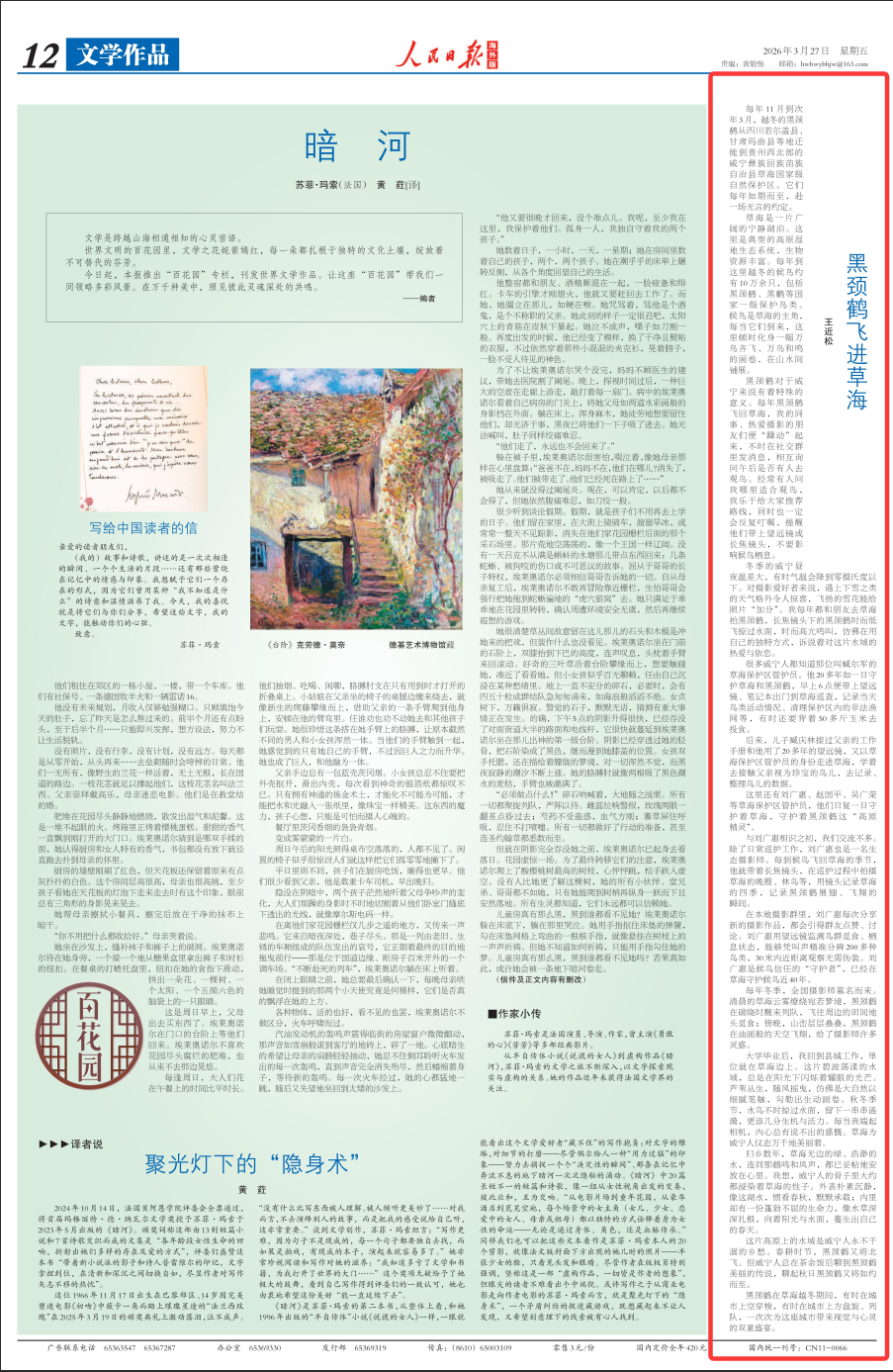 这篇散文既是对贵州生态文明建设成果的文学呈现,也传递着作者对家乡威宁的深厚情感。草海国家级自然保护区素有“高原明珠”“中国黑颈鹤之乡”的美誉,是全国黑颈鹤种群密度最大的越冬地,2026年1月监测显示,到草海越冬的黑颈鹤数量达2898只,再创新高。经过持续生态治理,草海水生植被覆盖度从2021年的9%跃升至2025年的66%,“水下草原”重现生机。王近松以文学之笔为草海的生态之美留下了生动的注脚。