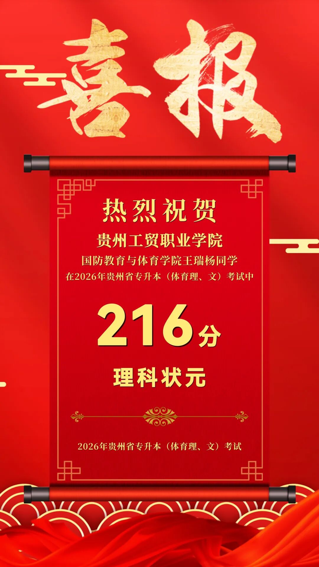 春风化雨育桃李,硕果飘香谱华章。在2026年贵州省普通高等学校专升本考试中,贵州工贸职业学院国防教育与体育学院2023级参考学子不负众望,全员过线,特向全院师生及社会各界报喜!